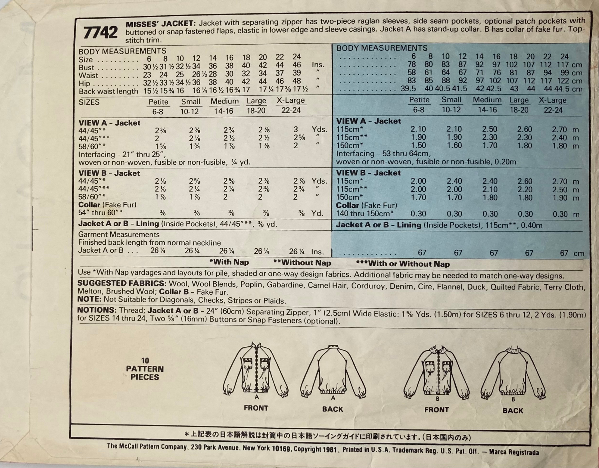 Misses' Bomber Jacket: The jacket, equipped with a separating zipper, boasts a design featuring two-piece raglan sleeves, convenient side seam pockets, and an optional choice of patch pockets adorned with buttoned or snap-fastened flaps. The lower edge and sleeve casings are elasticated for added comfort. Jacket variation A showcases a stand-up collar, while jacket B offers a collar crafted from exquisite faux fur, both complemented by meticulous top-stitch detailing. ©1981.