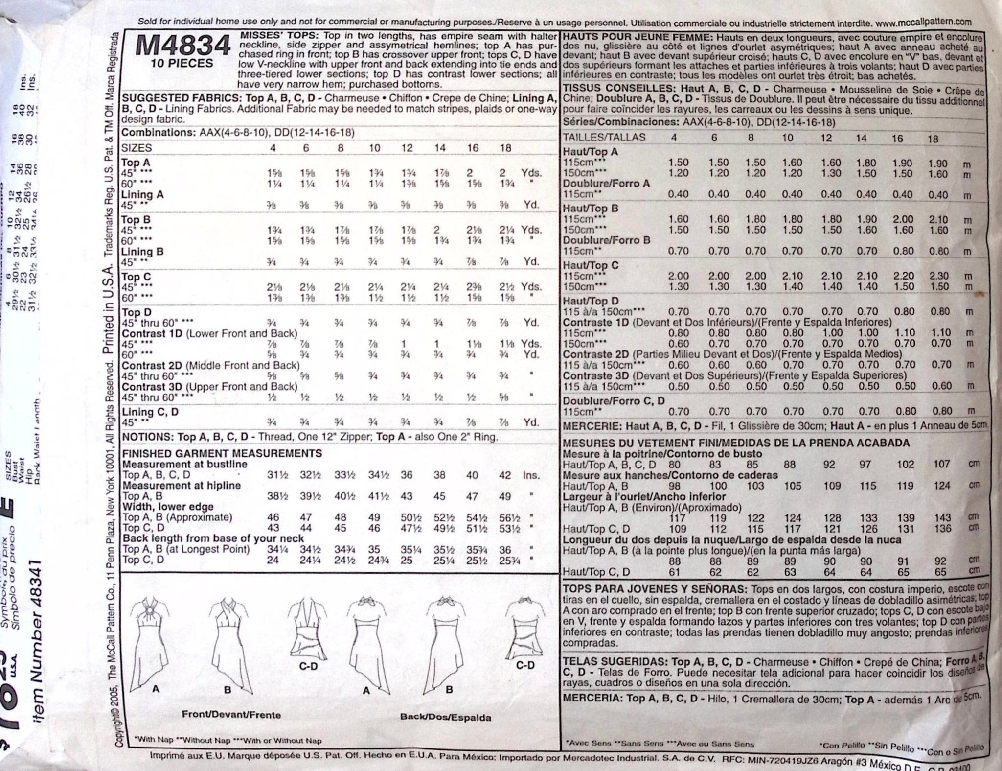 Misses' Tops: Unleash your inner fashion designer with Sewing Pattern: McCalls M4834! This pattern features trendy misses tops with an empire seam and halter neckline, perfect for creating unique and stylish outfits. The asymmetrical hemlines add an extra touch of flair. Get ready to rock the runway (or the sidewalk) with this versatile and chic pattern. ©2005.