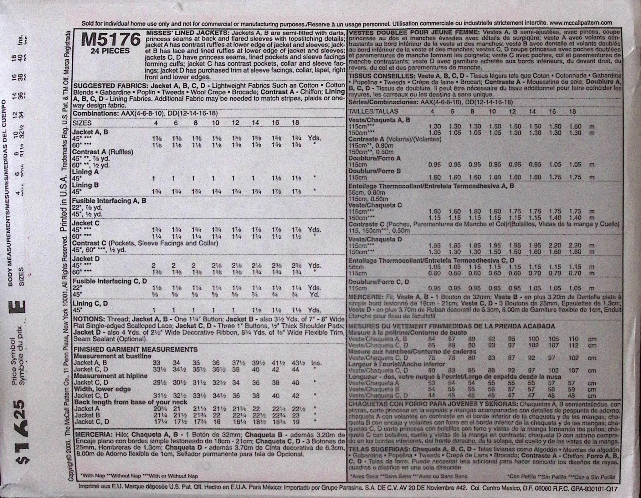 Misses’ Lined Jackets: The semi-fitted jackets feature darts and princess seams at the back, ensuring a flattering silhouette. The flared sleeves are adorned with topstitching details, adding a touch of chic elegance. Choose from various design options, including contrast ruffles at the lower edge of the jacket and sleeves, or opt for lace and lined ruffles for a feminine touch. Alternatively, select the princess seams, lined pockets, and sleeve facings forming cuffs for a structured look. Additional variations include contrast pockets, collar, and sleeve facings, with the option to enhance the jacket with purchased trim at sleeve facings, collar, lapel, right front, and lower edges. This pattern provides endless possibilities for creating jackets that are as stylish as they are unique. ©2006.