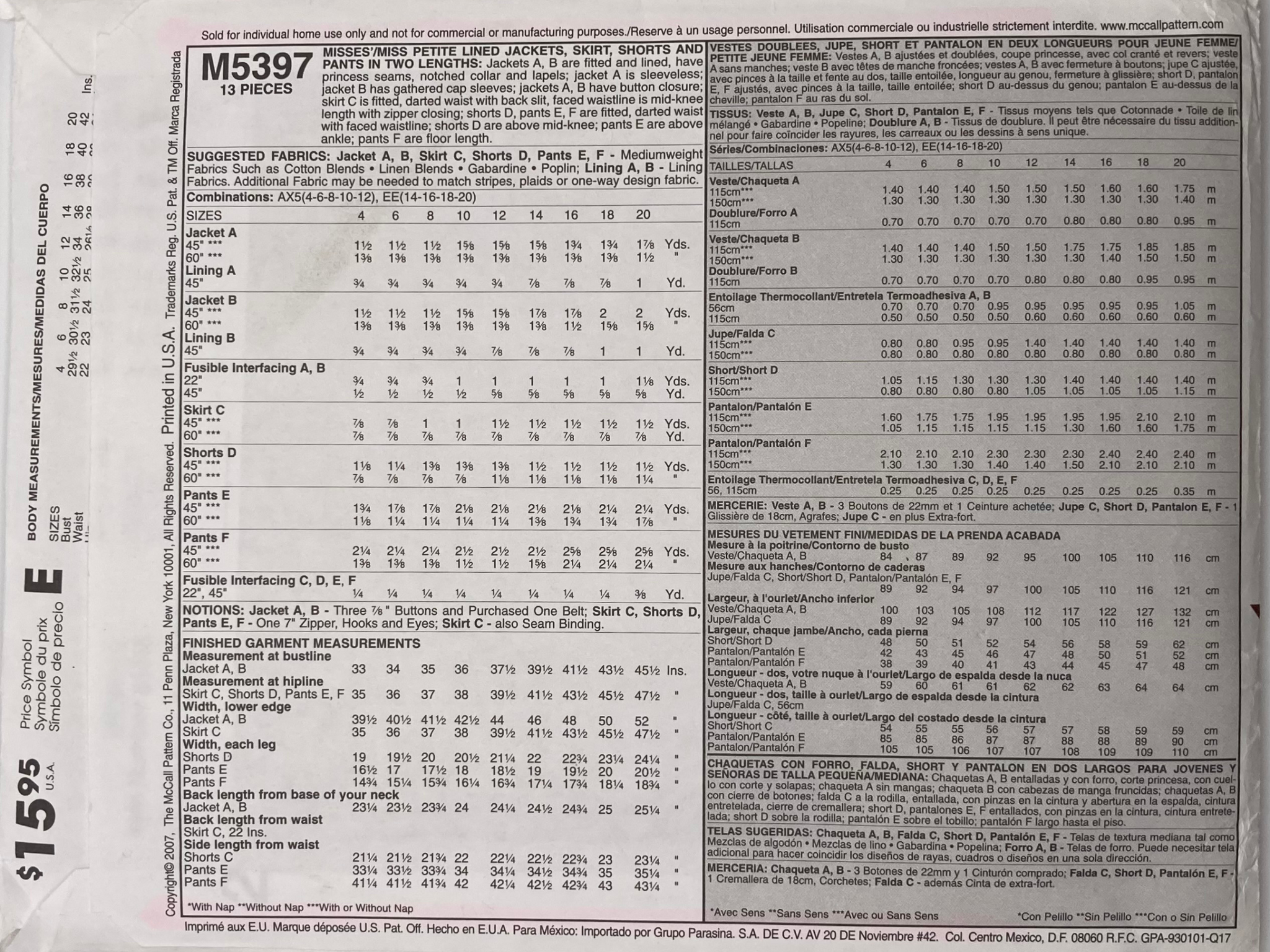 Misses' Coordinates: This pattern from the Woman's Day Collection allows you to create stylish and fitted jackets for misses, featuring princess seams, a notched collar, lapels, and a button closure for a sophisticated look. The pattern also includes options for a fitted skirt with darted waist and back slit, as well as fitted shorts and pants in two lengths, providing a versatile set of wardrobe staples for any fashion-forward woman. ©2007.