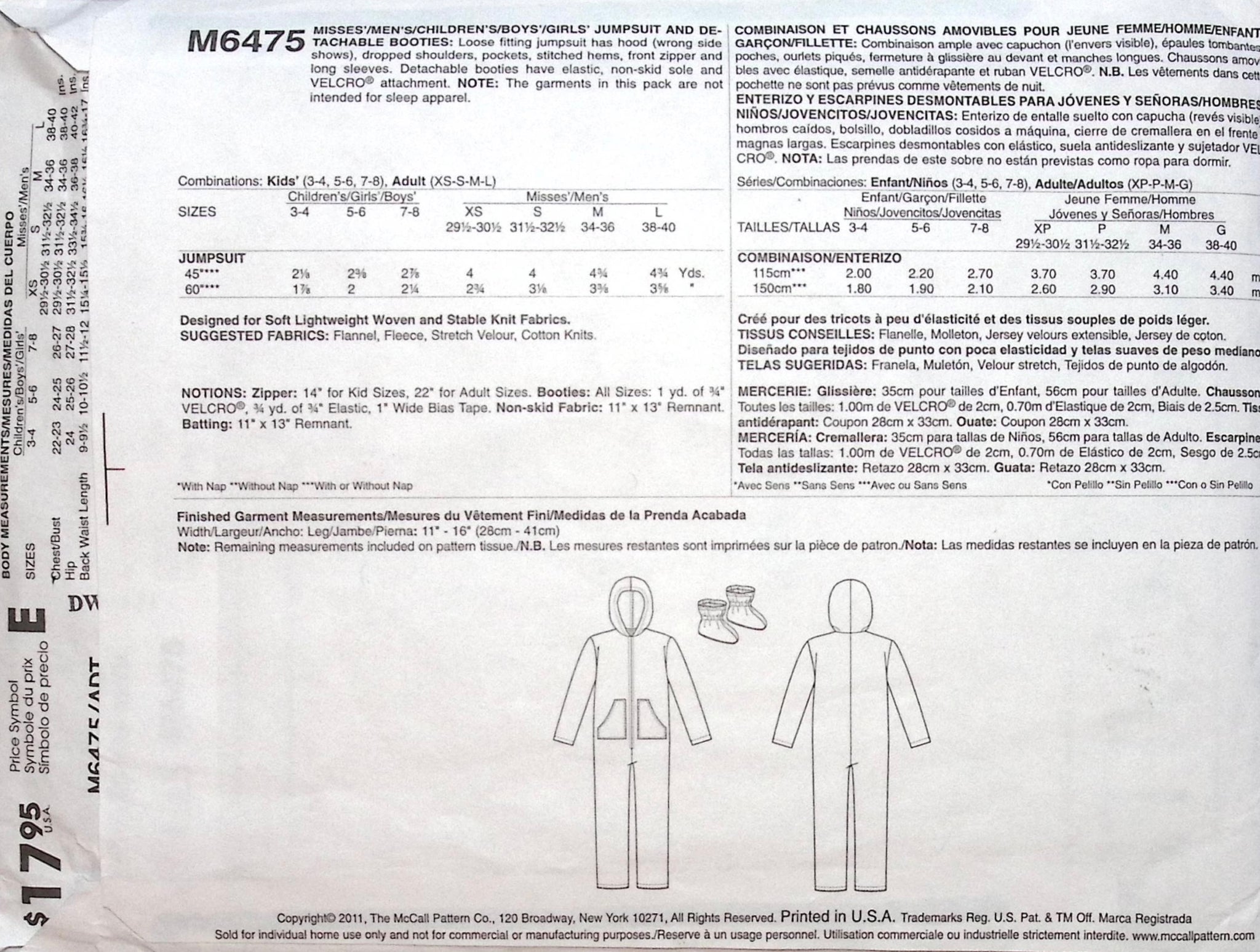 Families Jumpsuit & Detachable Booties: A versatile sewing pattern for jumpsuits and detachable booties suitable for everyone in the family. The loose-fitting jumpsuit features a hood with the wrong side showing, dropped shoulders, pockets, stitched hems, a front zipper, and long sleeves for comfort. The detachable booties, equipped with elastic, non-skid soles, and Velcro® attachment, provide practicality and ease of use. Create cozy and functional outfits for every member of your family with this adaptable pattern. ©2011.