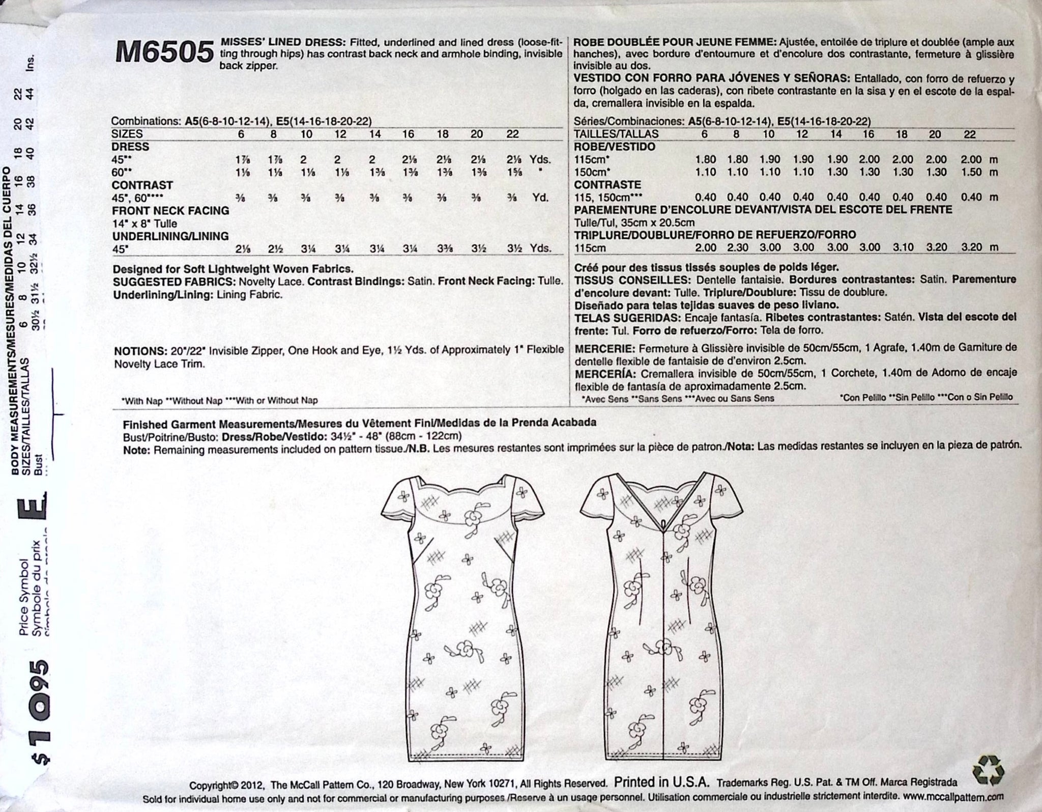 Misses' Lined Dress: Get ready to turn heads in the Misses' Lined Dress sewing pattern by McCalls M6505. This fitted dress, with contrast back neck and armhole binding, is perfect for any special occasion. With an invisible back zipper and a loose fit through the hips, you'll feel both comfortable and stunning. Sewing has never been so chic! ©2012.