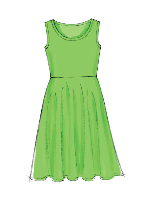 Girl's Dress: Create adorable pullover dresses for the special girls in your life with this McCalls sewing pattern offering six charming variations. Mix and match design elements including different back bodices, skirt options, and a flattering raised waist silhouette. Styles B and D feature practical back bands, while A, B, and E showcase delicate narrow hems. For a playful touch, styles C, D, and F include gathered skirts with professionally stitched hems. Engineered for medium-weight moderate stretch knits, this pattern ensures comfortable, well-fitting garments that young sewers and gift-makers will love creating. ©2022.