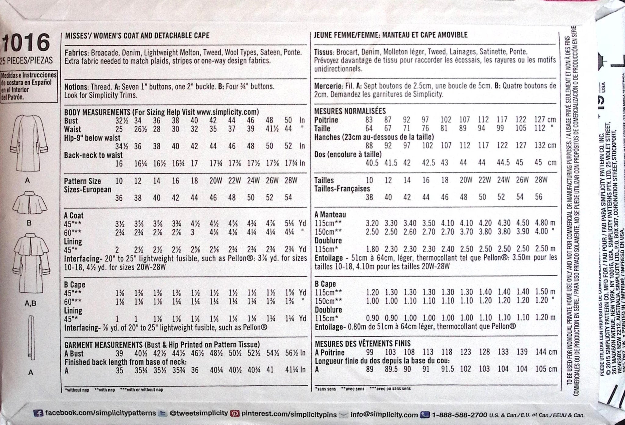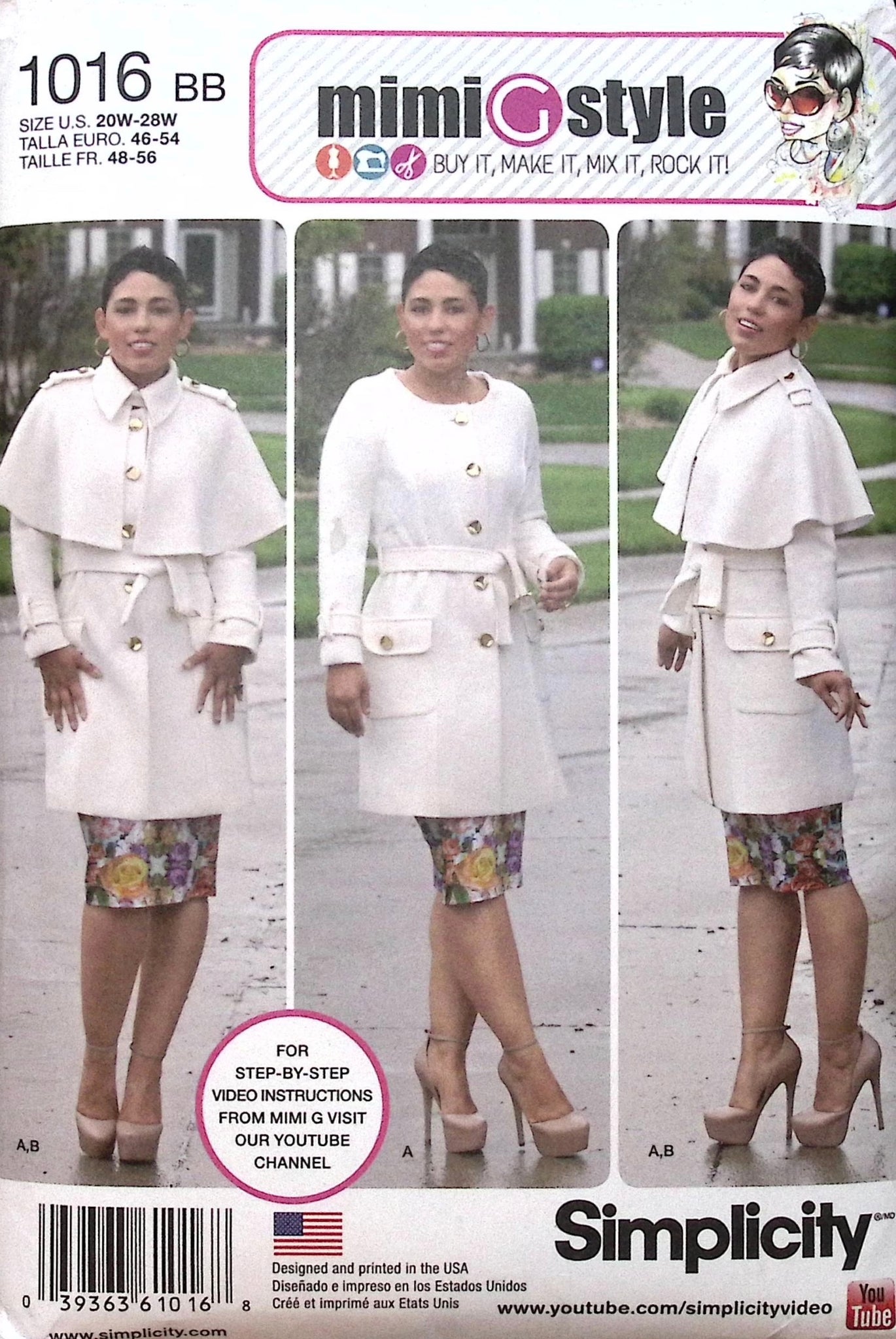 Misses' Coat with Detachable Cape: Get ready to sew up style with Simplicity 1016's versatile coat pattern! Designed by Mimi G for miss and plus sizes, this collarless coat features patch pockets and an optional belt, plus a removable cape with collar and epaulettes. ©2015.