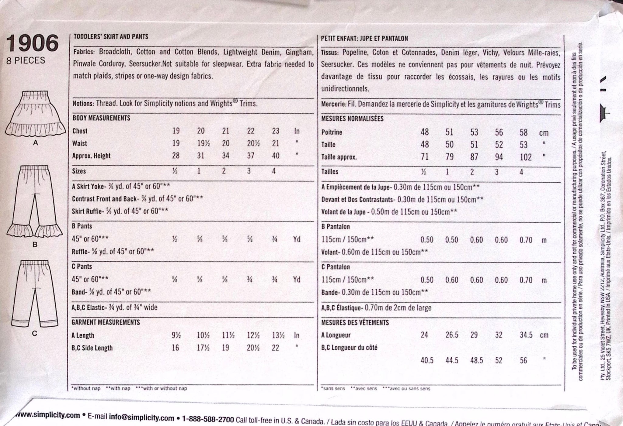 Toddlers' Skirt & Pants: Add a sweet touch to your little one's wardrobe with our Simplicity 1906 sewing pattern. Create adorable flared ruffle skirts and pants with cute cuff variations for your toddler. Perfect for both playtime and special occasions. Make dressing up a fun and stylish experience! ©2012.