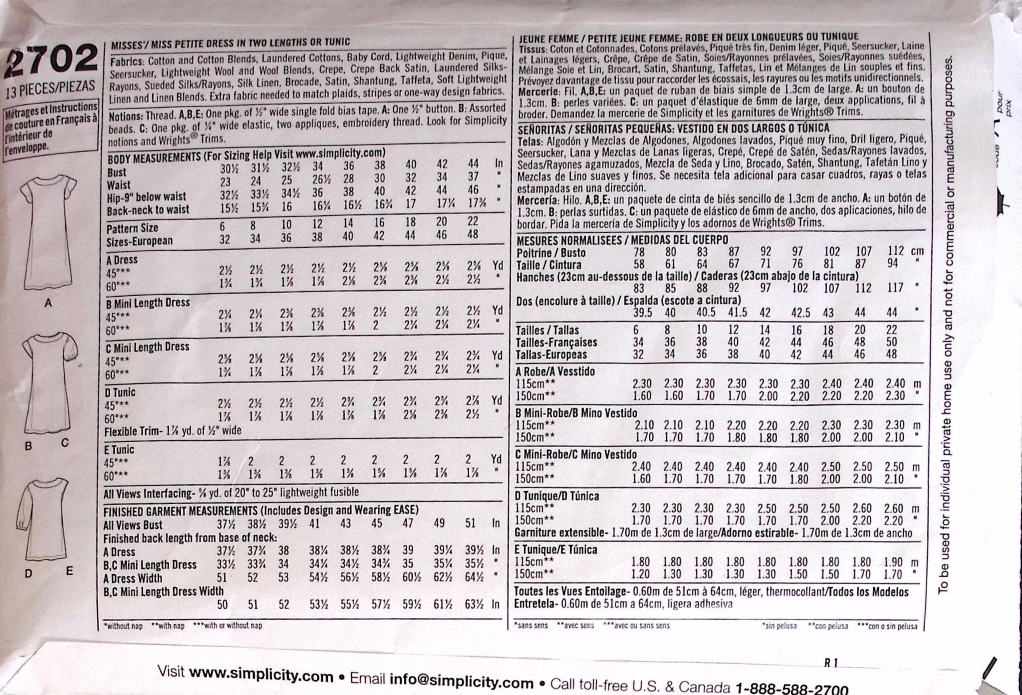 Misses' Dress or Tunic: Unleash your creativity with Sewing Pattern: Simplicity 2702. Create a stylish Misses' dress or tunic featuring a slit front collar, front pleat detail, and patch pocket options. Extended shoulders provide versatile sleeve options including cap, short puff, and gathered three-quarter length. Experience fashion with a twist! ©2010.