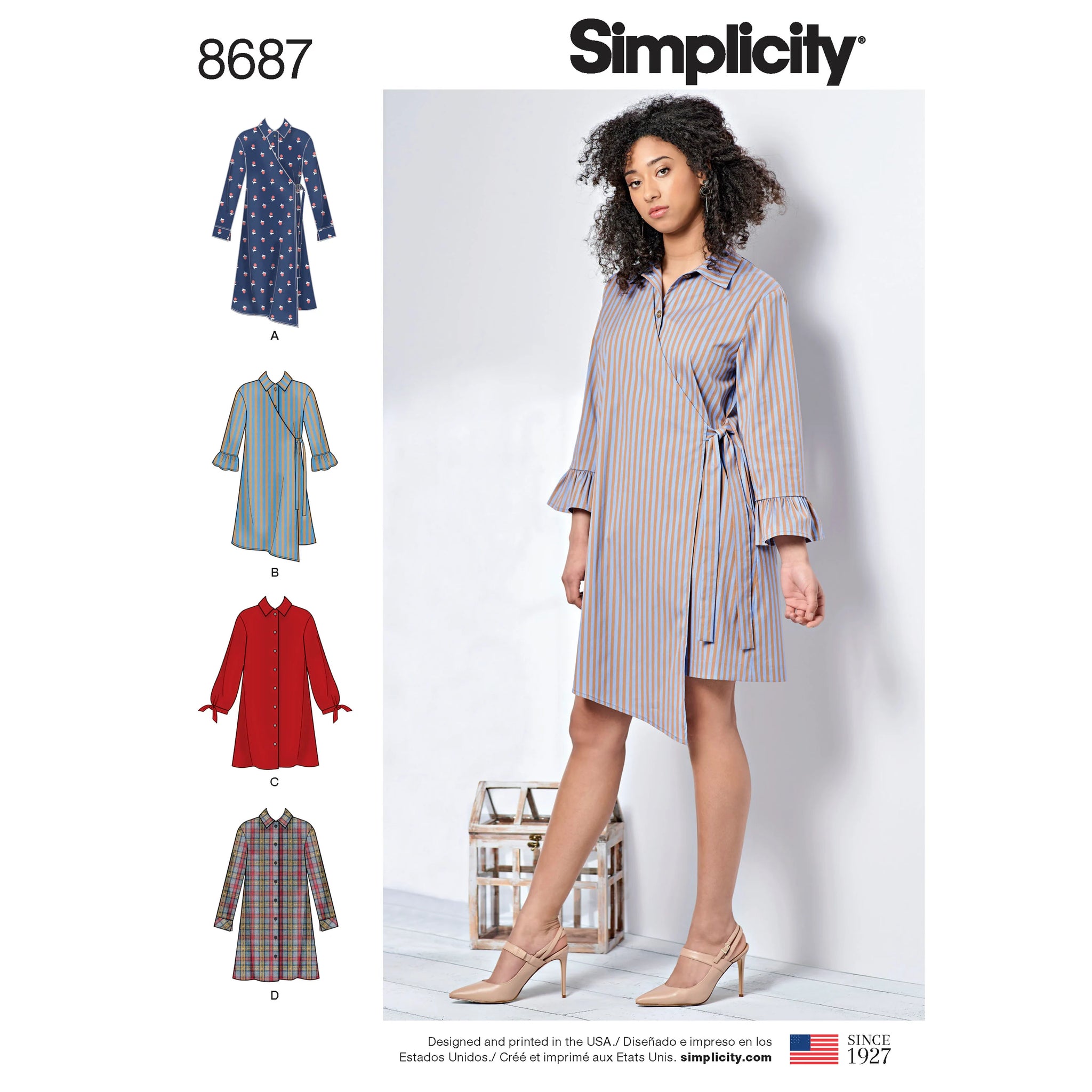 Misses' Shirt Dress: Elevate your wardrobe with this versatile sewing pattern that reimagines the timeless shirt dress. Simplicity 8687 offers a contemporary twist featuring a flattering wrap-front design and relaxed swing silhouette that suits all body types. Choose from multiple sleeve options to customise your look for any season or occasion. Perfect for sewers seeking a modern staple that transitions effortlessly from casual to polished, this pattern includes sizes for both Misses and Women. Create a dress that's uniquely yours and enjoy the satisfaction of wearing something handmade. ©2018.