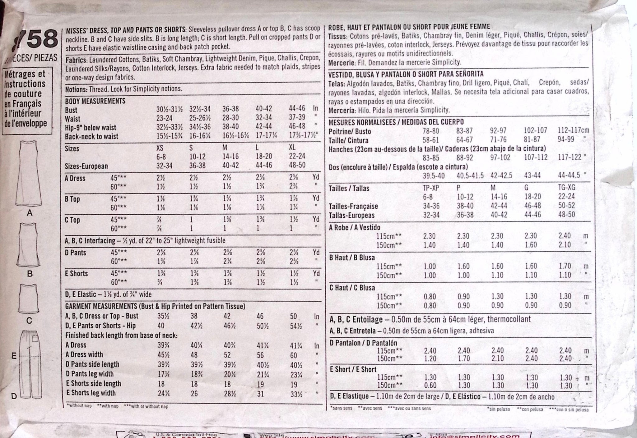 Misses' Dress, Top, Pants or Shorts: Easily create a stylish 2 Hour Sewing Pattern dress, top, or bottoms with this versatile design. The sleeveless pullover dress or top features a scoop neckline and optional side slits, while the pull-on cropped pants or shorts complete the look. Perfect for any fashion-forward individual looking to enhance their wardrobe with minimal effort. ©2000's.