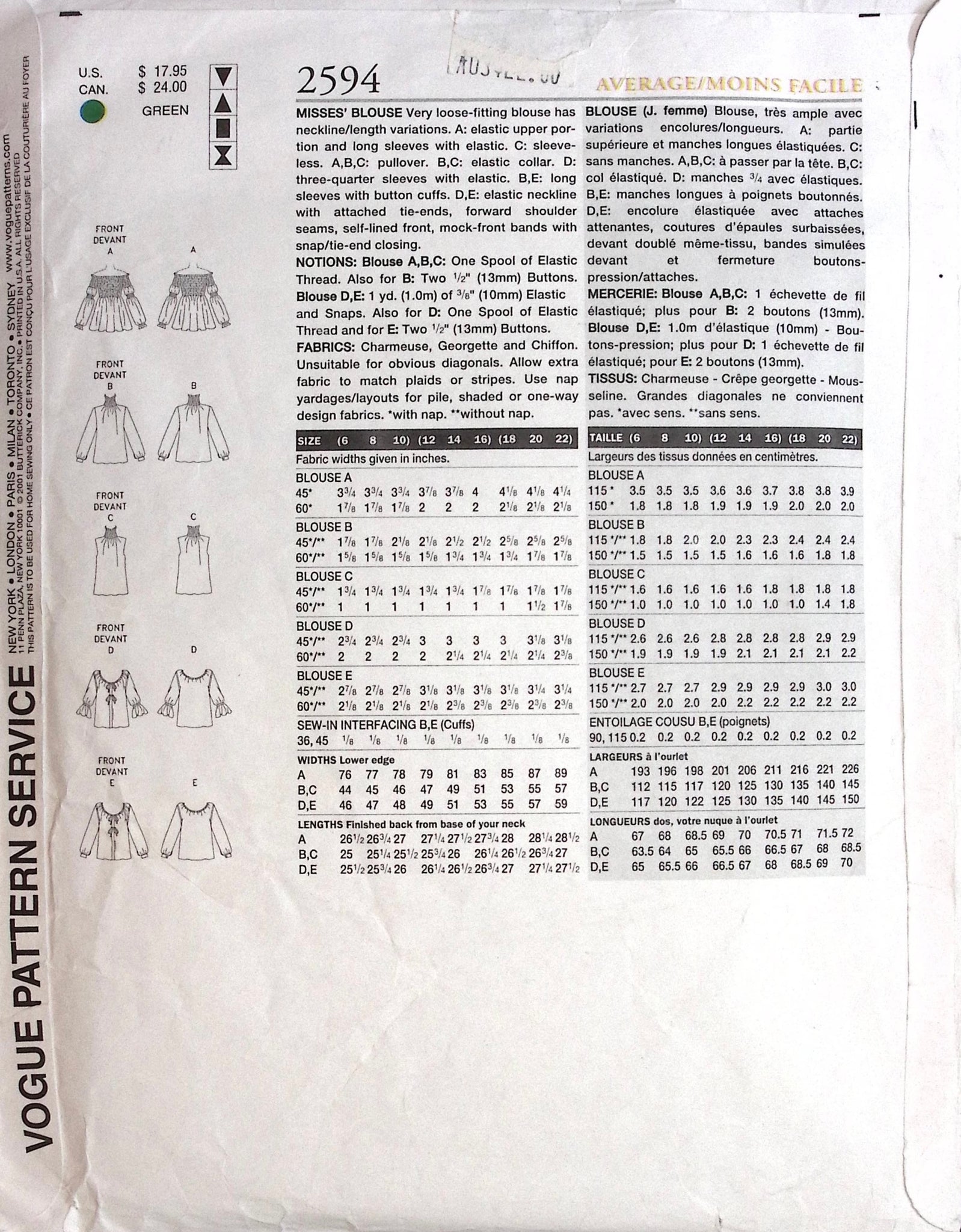 Misses' Blouse: A range of neckline and length variations to suit your style. The very loose-fitting design comes in multiple options: A features an elastic upper portion and long sleeves with elastic for a comfortable and relaxed look. C is sleeveless, providing a breezy and chic option. Whether you prefer a pullover style like A, B, and C, or a more intricate design, D and E offer three-quarter sleeves with elastic for a touch of sophistication. Both D and E boast an elastic neckline with attached tie-ends, forward shoulder seams, a self-lined front, and mock-front bands with snap/tie-end closing, adding unique flair to your blouse collection. Explore the possibilities and express your individuality with this versatile pattern. ©2001.