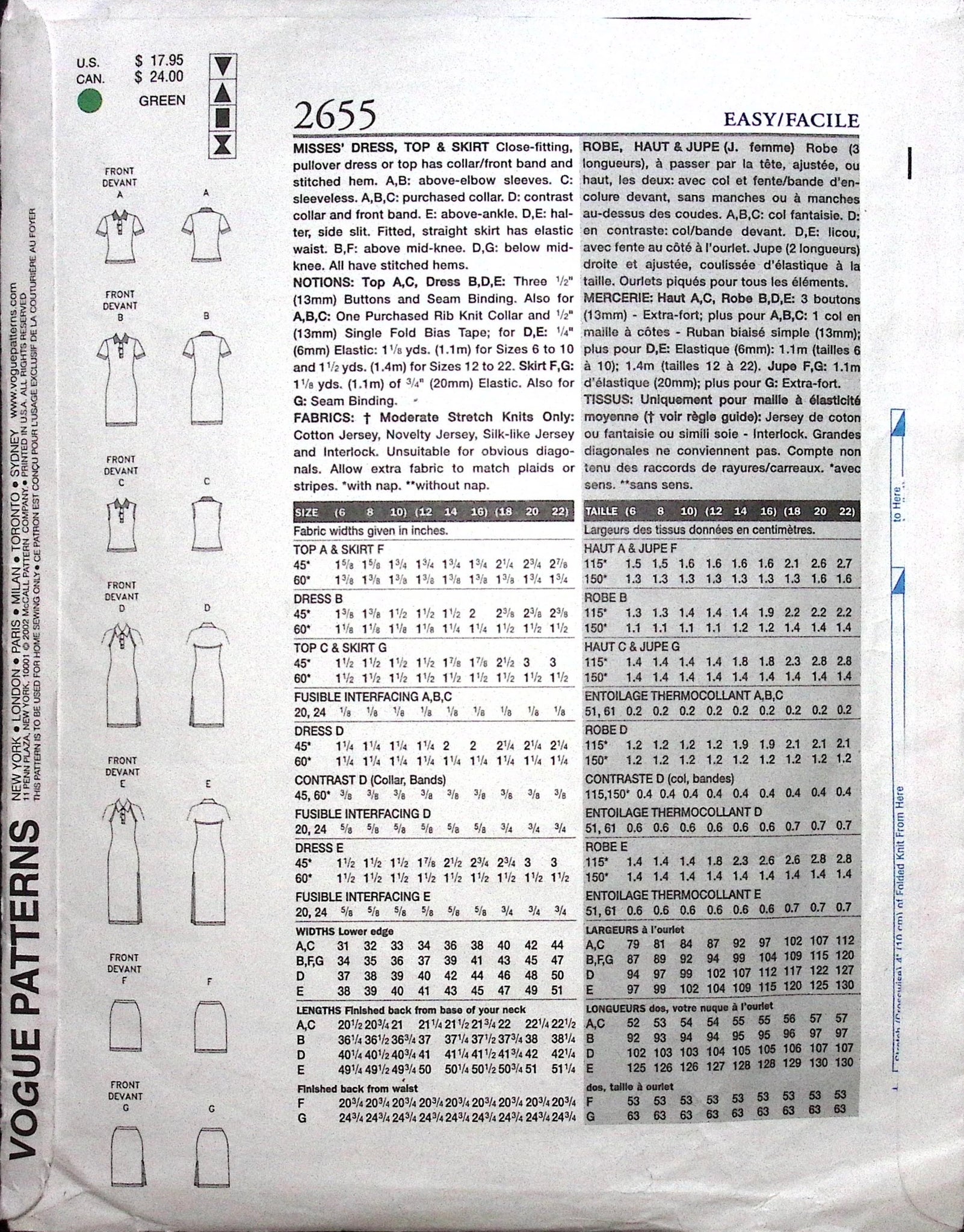 Misses’ Dress, Top & Skirt: The close-fitting, pullover dress or top features a collar and front band, creating a polished and modern look with a stitched hem. Choose from three sleeve options: above elbow, sleeveless, or a trendy halter neck, allowing you to tailor your outfit to the season or event. The fitted straight skirt, complete with an elastic waist, adds a touch of sophistication to your ensemble. Whether you prefer an above-knee, below-knee, or above-ankle length, this pattern provides flexibility for creating a wardrobe that suits your personal style and occasions. ©2002.