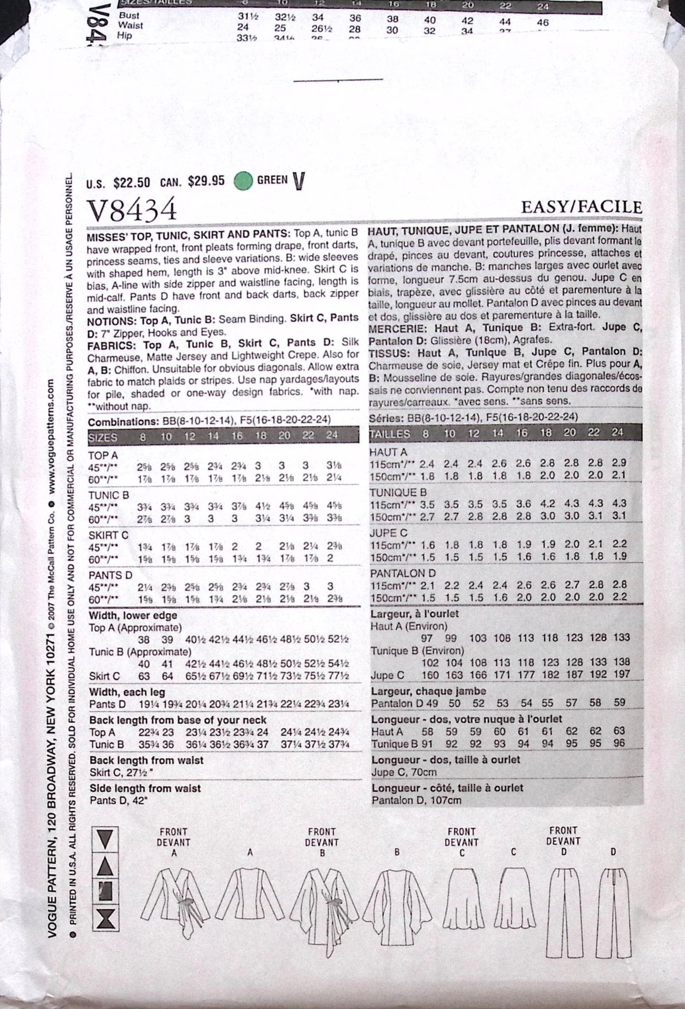 Misses' Top, Tunic, Skirt & Pants: Transform your wardrobe with The Vogue Woman collection. Top A and tunic B showcase a wrapped front, front pleats forming an elegant drape, front darts, princess seams, ties, and various sleeve options for a personalised touch. Tunic B boasts wide sleeves with a shaped hem, achieving a stylish length just 3 inches above the mid-knee. Skirt C, cut on the bias, offers an A-line silhouette with a side zipper and waistline facing, ensuring a flattering mid-calf length. Pants D, with front and back darts, back zipper, and waistline facing, complete this versatile ensemble, providing both comfort and sophistication for your fashion-forward endeavours. ©2007.