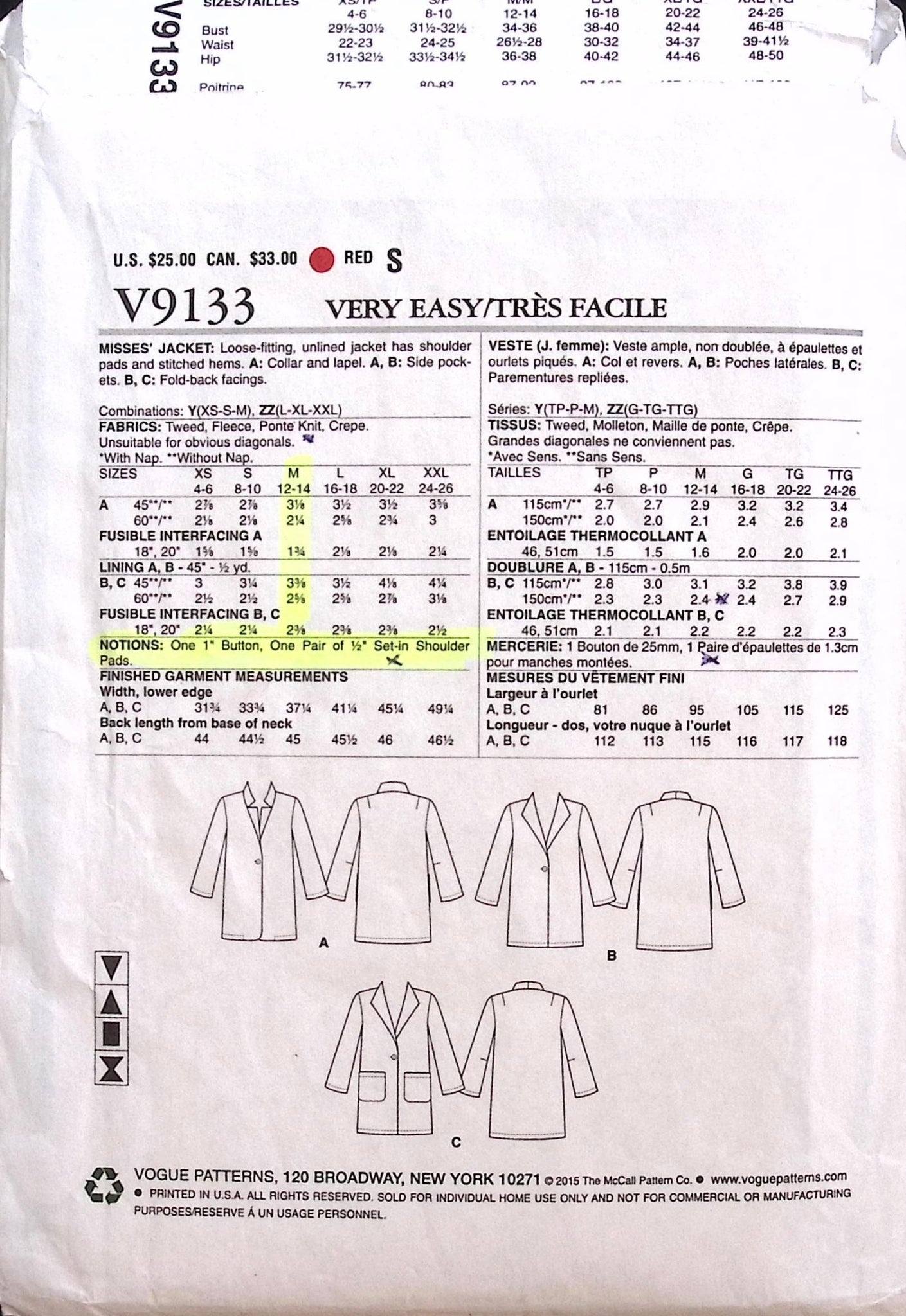 Misses' Jacket: Create your own unique style with the Vogue V9133 Sewing Pattern! This misses jacket allows for a loose fit and is unlined for ultimate comfort. Add some structure to your look with the included shoulder pads, and finish with impeccably stitched hems. Change up your wardrobe with this versatile and customisable pattern. ©2015.