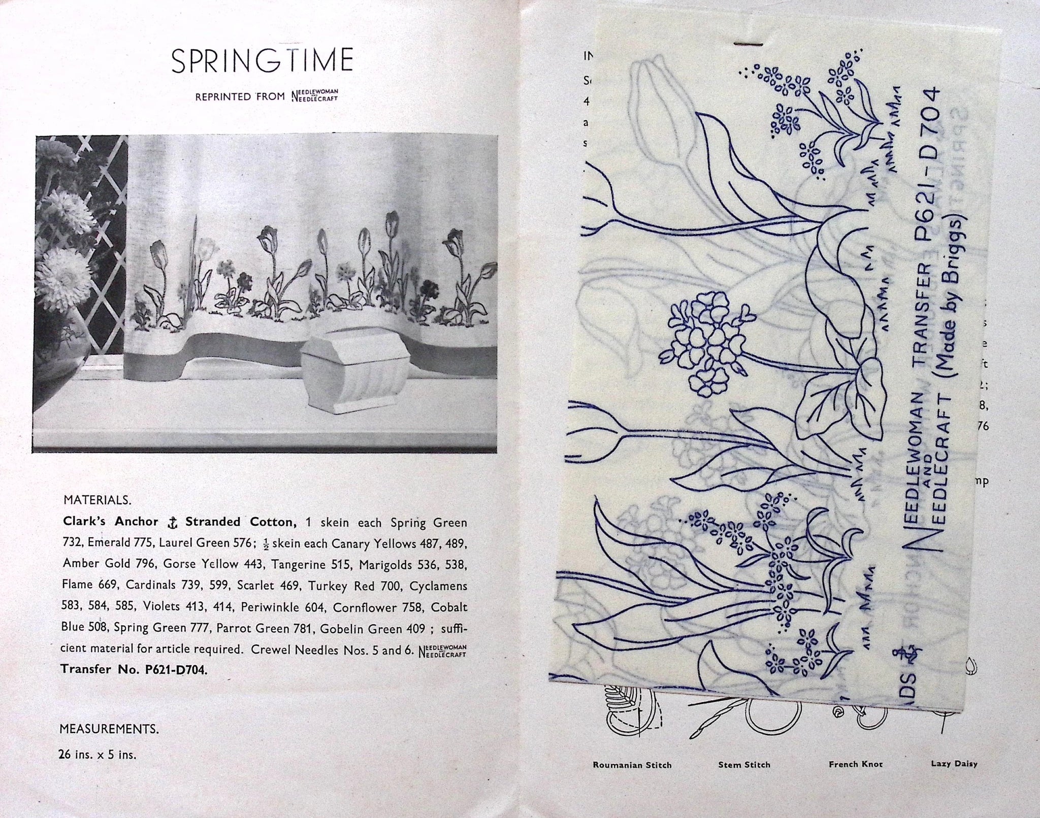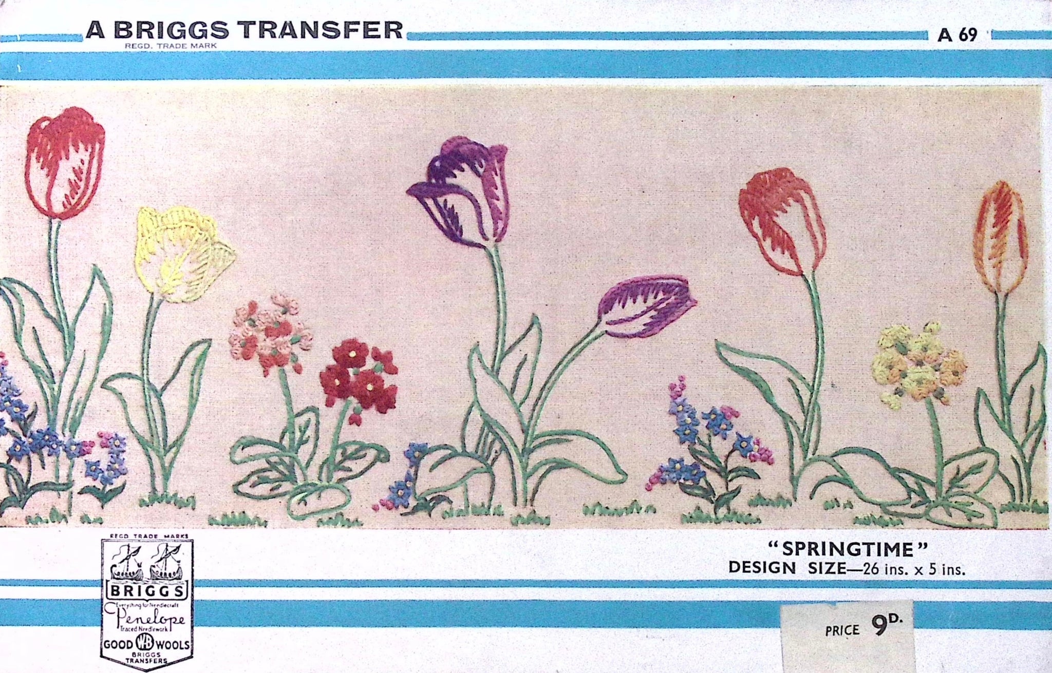 Springtime: Get your vintage vibe on with our Embroidery Transfer! Delicate springtime tulips and flowers (no weeds here) will bring a touch of whimsy to any project. Perfect for adding a retro feel to your embroidery. Don't miss out on this unique and playful addition to your crafting collection! ©1950's.