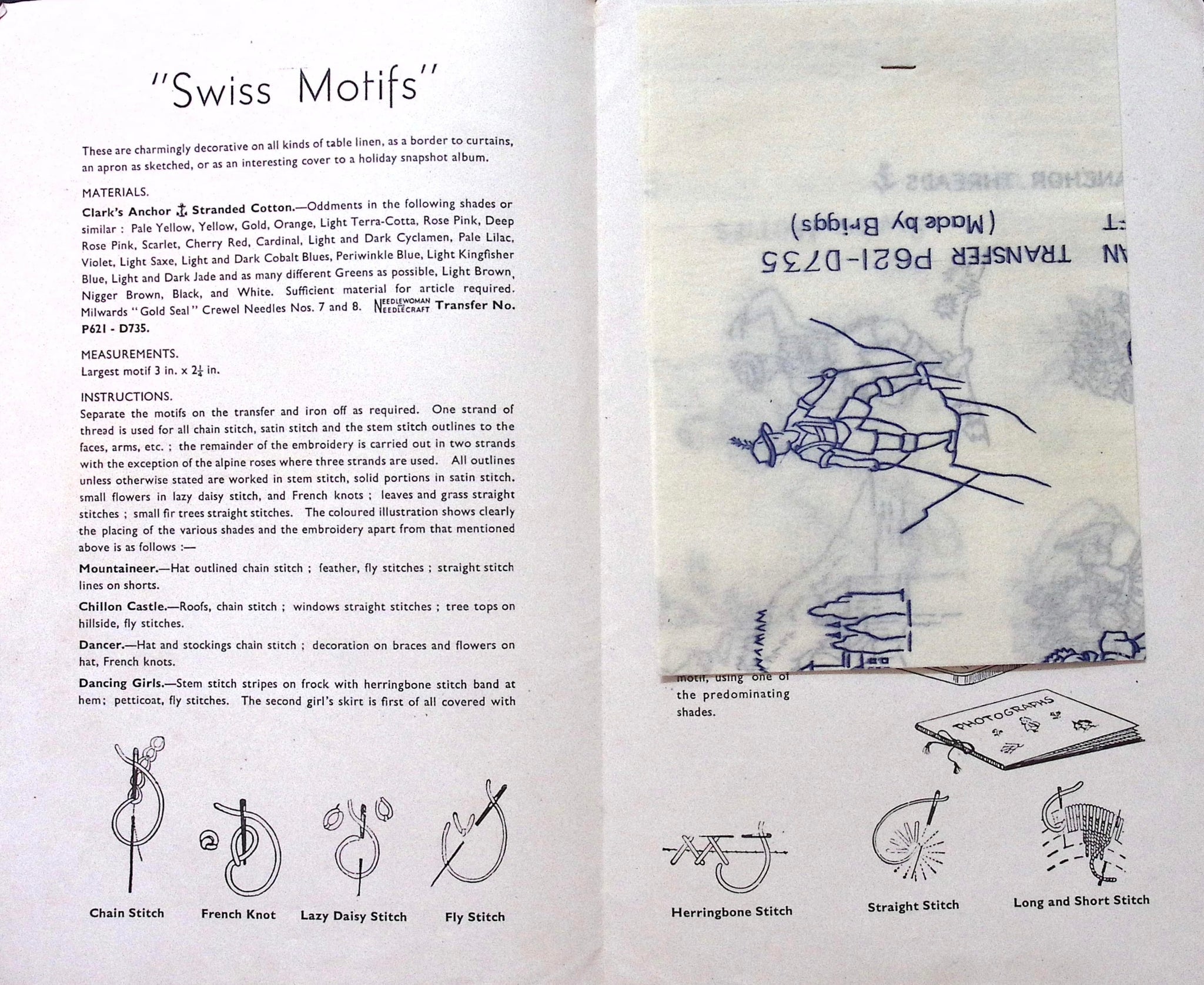 Swiss Motifs: This vintage embroidery transfer by Briggs features charming and intricate Swiss motifs. Add a touch of whimsy to your handiwork with these unique designs. Your projects will be oozing with character and personality when you incorporate these playful Swiss motifs. ©1950's.