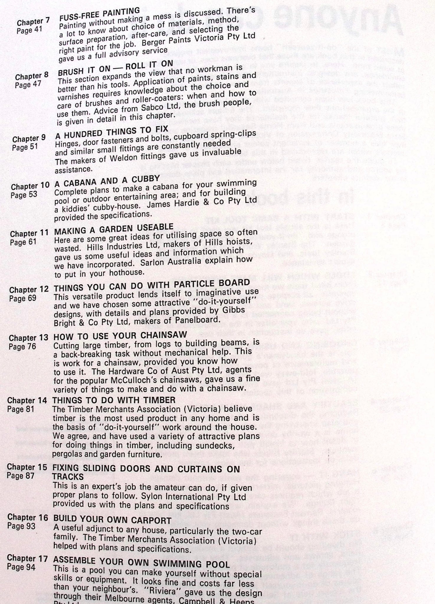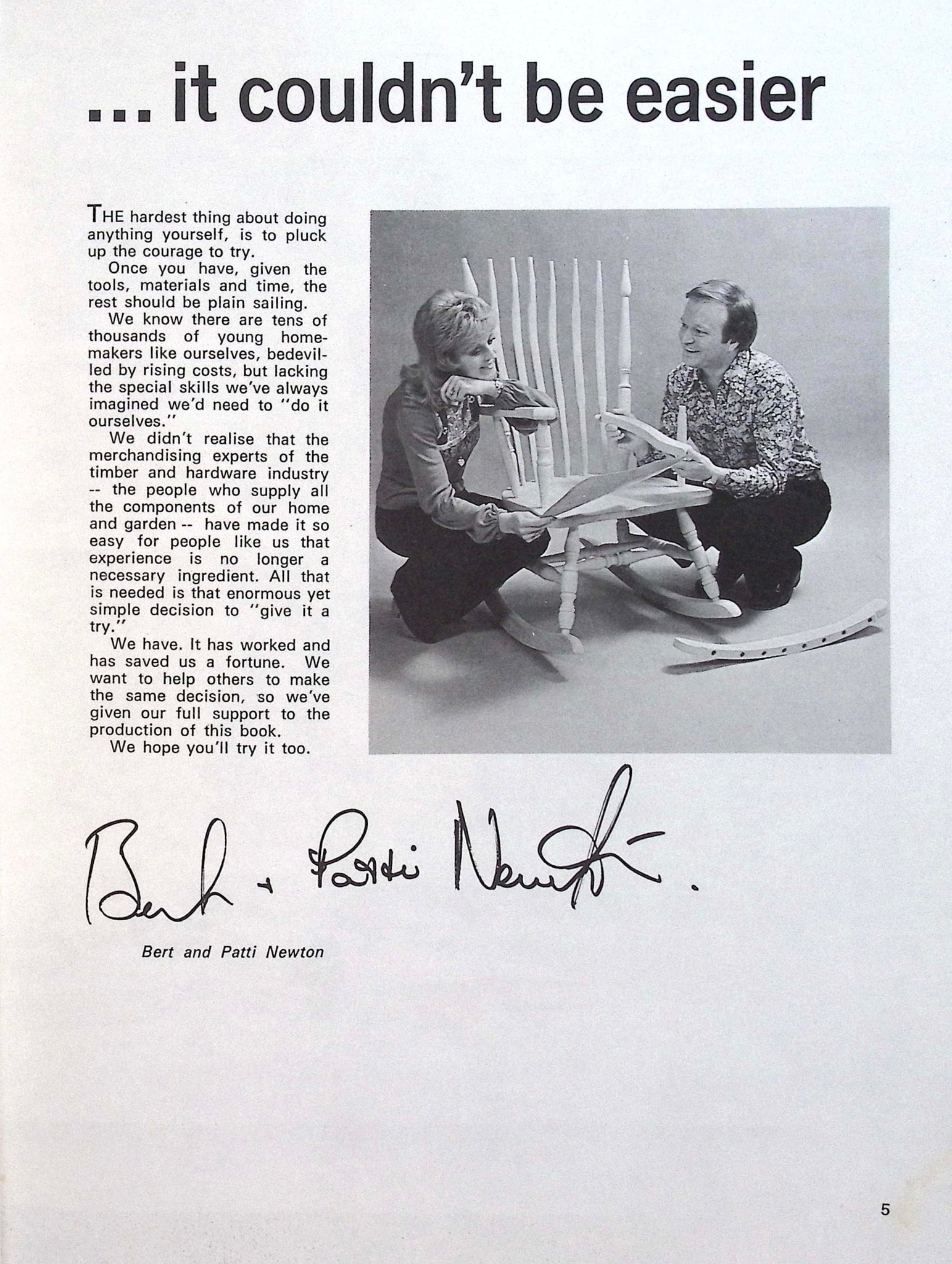 "Anyone Can Do It" is a practical "how-to" home improvement and renovation book from 1976, endorsed by Bert and Patti Newton. This comprehensive guide is designed to empower DIY enthusiasts with step-by-step instructions and expert advice. Organised into chapters covering essential topics like "Start With a Basic Tool Kit," "Beautify and Shade Your Home," "Hang It," "How to Use Your Chainsaw," "Fixing Sliding Doors," "Build Your Own Carport," and more, it provides a wealth of information for homeowners looking to tackle various projects. With the endorsement of Bert and Patti Newton, this book promises to be an invaluable resource for anyone seeking to improve their home with confidence and skill. ©1976.