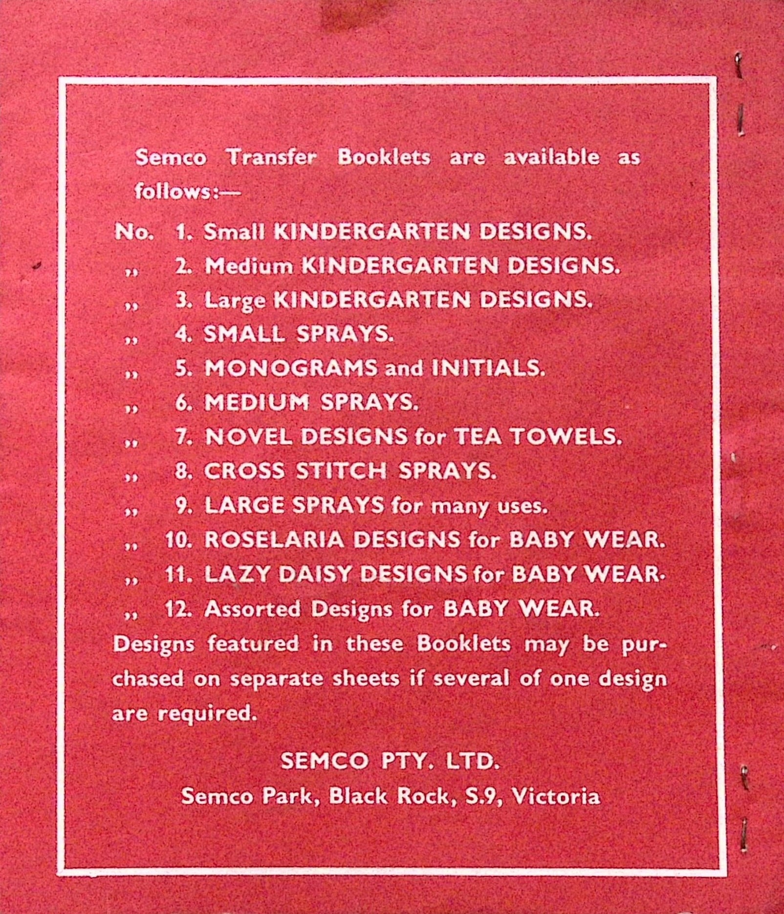 Book 2: Kindergarten Designs: Get crafty with the Vintage Semco Transfer Booklet! This booklet features medium embroidery designs perfect for kindergarten-age children's clothing or accessories, as well as playful motifs like marching bands, clowns, chicks, lambs, and elephants. Perfect for adding a unique touch to any project. Let your creativity run wild! ©1950's.