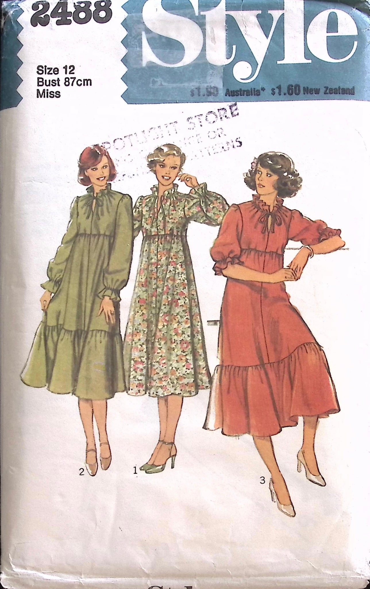 Misses' Dress: This flared pull-over dress captures the essence of the era with a front slit opening and a self-fabric drawstring at the neckline, forming a charming ruffle. The sleeves, gathered at the head, have an elasticized lower edge forming another delightful ruffle. The skirt is gathered to the bodice above the normal waistline, offering a flattering silhouette. You also have the option of adding a deep frill for an extra touch of flair. Embrace the '70s vibe in your wardrobe with this versatile pattern, combining comfort and vintage charm. ©1979. RARE FIND!
