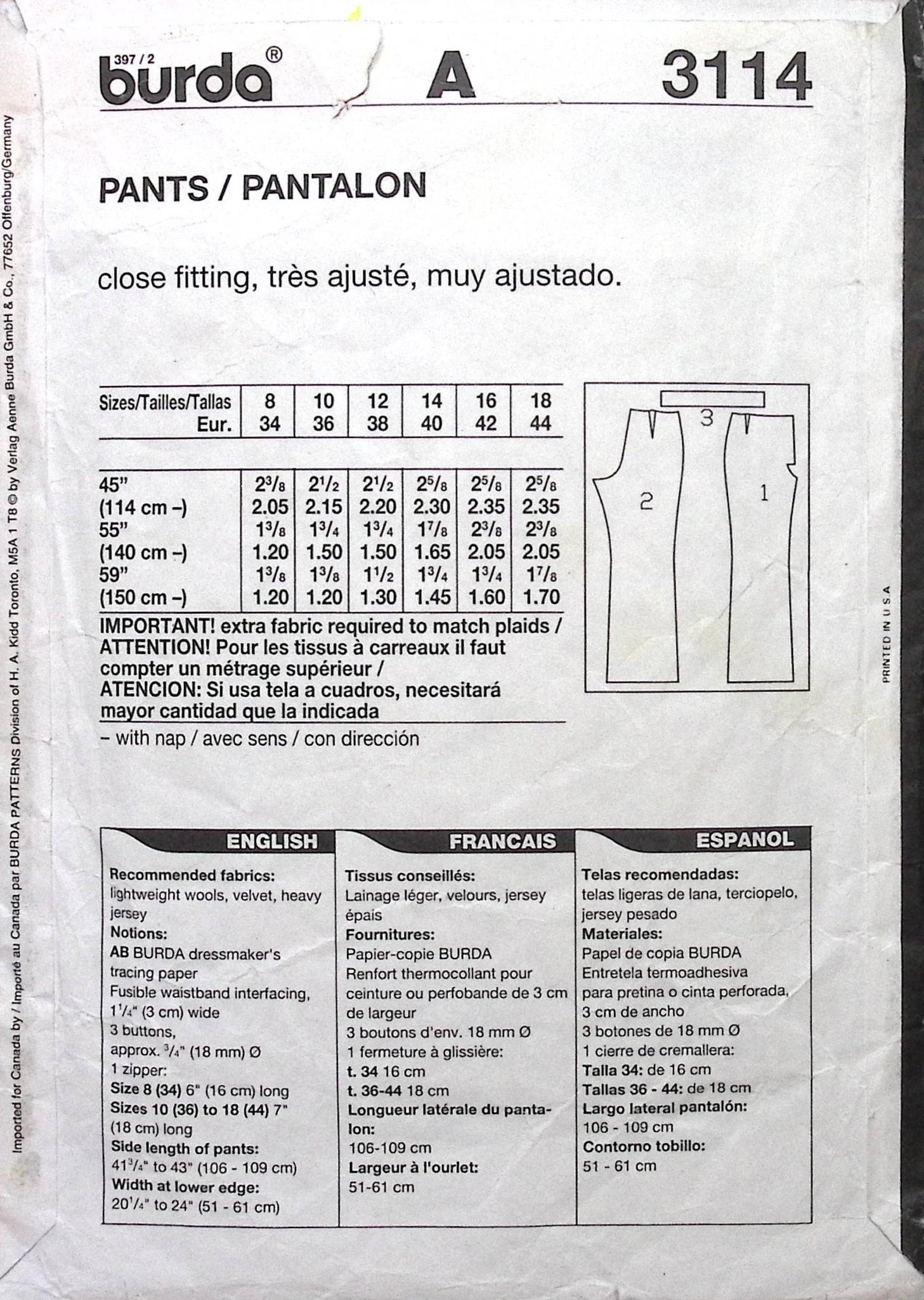 Misses' Pants: Add some flare to your wardrobe with the Vintage Sewing pattern: Burda 3114! Close fitting for a flattering shape, these misses pants will have you feeling confident and stylish. Perfect for any occasion, these pants will become a staple in your closet. ©1997.