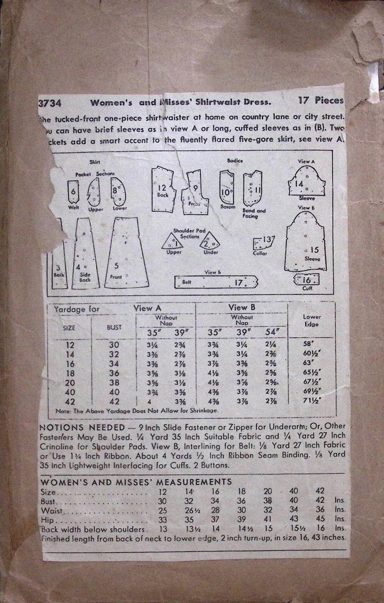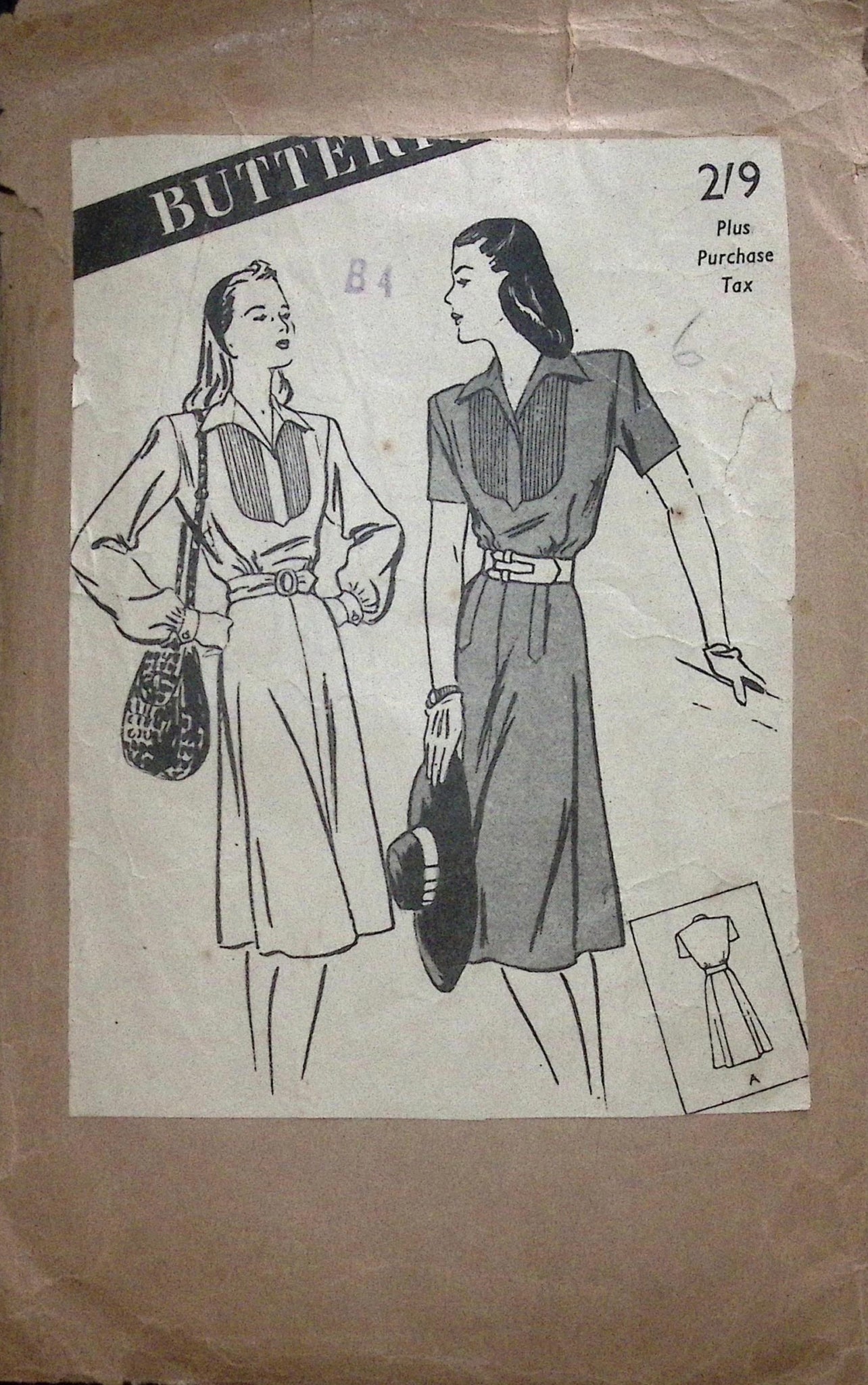 Misses’ Shirtwaist Dress: This tucked-front, one-piece shirtwaister captures the charm of both country lanes and city streets. Choose between brief sleeves for a breezy look as seen in view A, or opt for long, cuffed sleeves for added sophistication. The fluently flared five-gore skirt adds a graceful touch, allowing for comfortable and stylish movement. Smartly accentuated with two pockets, this dress blends practicality with vintage flair, making it a versatile choice for various occasions. Embrace the classic silhouette and tailored details of the 1940s with this pattern, creating a dress that effortlessly embodies the charm of that era. ©1940's.