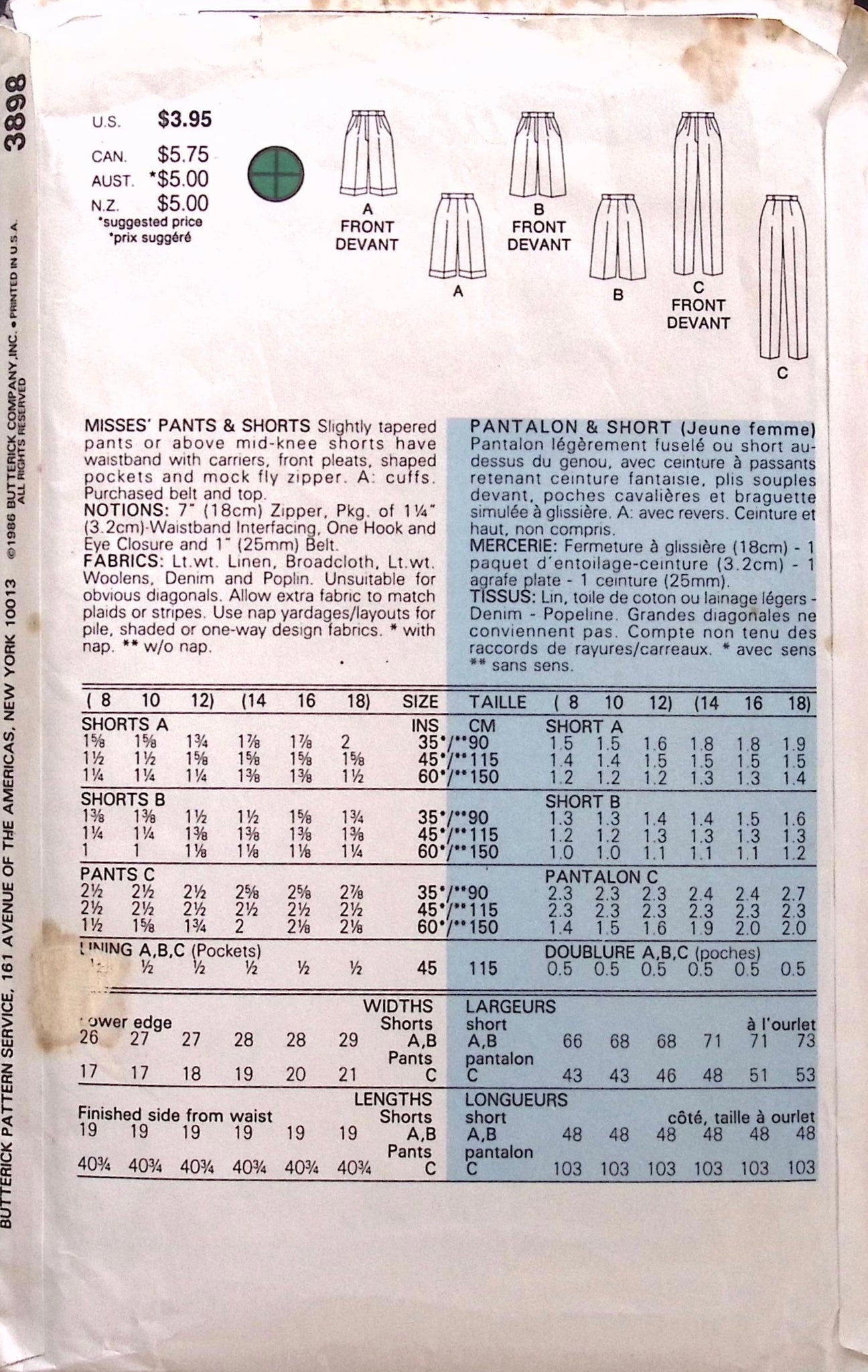 Misses' Shorts & Pants: Get ready to sew some vintage vibes with the Vintage Sewing Pattern: Butterick 3898! These 1980's misses pants & shorts will add a stylish touch to any wardrobe. No more worrying about finding the right size, make it yourself and rock these unique bottoms with confidence. ©1986.