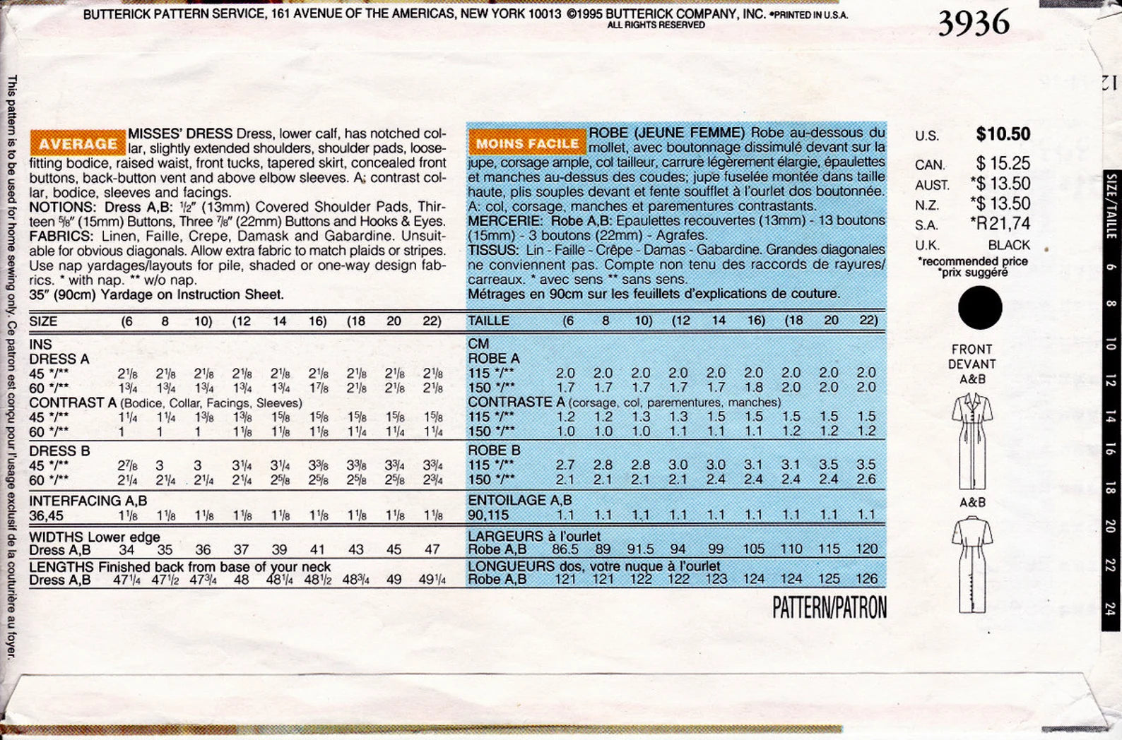 Misses' Dress: Get ready to turn heads in this vintage dress designed by Jessica Howard! The fitted bodice, raised waist, and tapered skirt create a flattering silhouette, while the unique notched collar adds a touch of charm. With convenient concealed front buttons and a back buttoned vent, this dress is both stylish and practical. ©1995.
