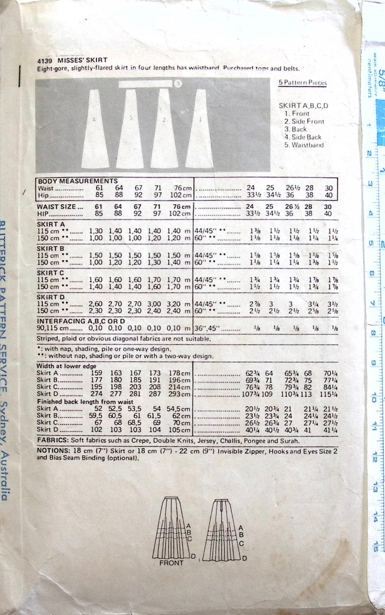 Misses’ Skirts: This pattern presents a stylish and versatile option for any wardrobe. With its eight-gore design, the skirt offers a slightly flared silhouette that comes in four lengths to suit various preferences. Complete with a waistband and zipper closure, it combines both elegance and practicality for effortless wear and timeless appeal. ©1970’s.