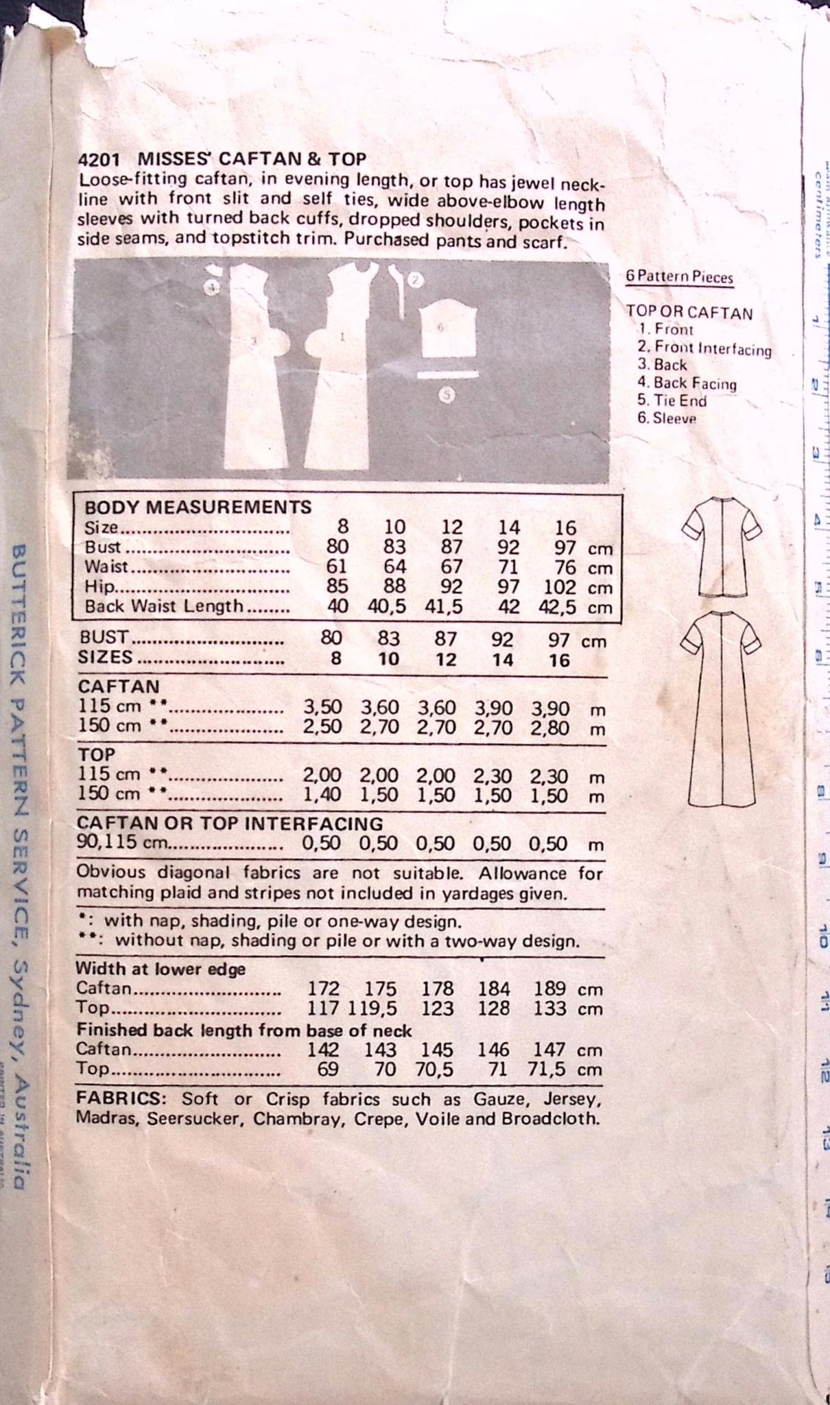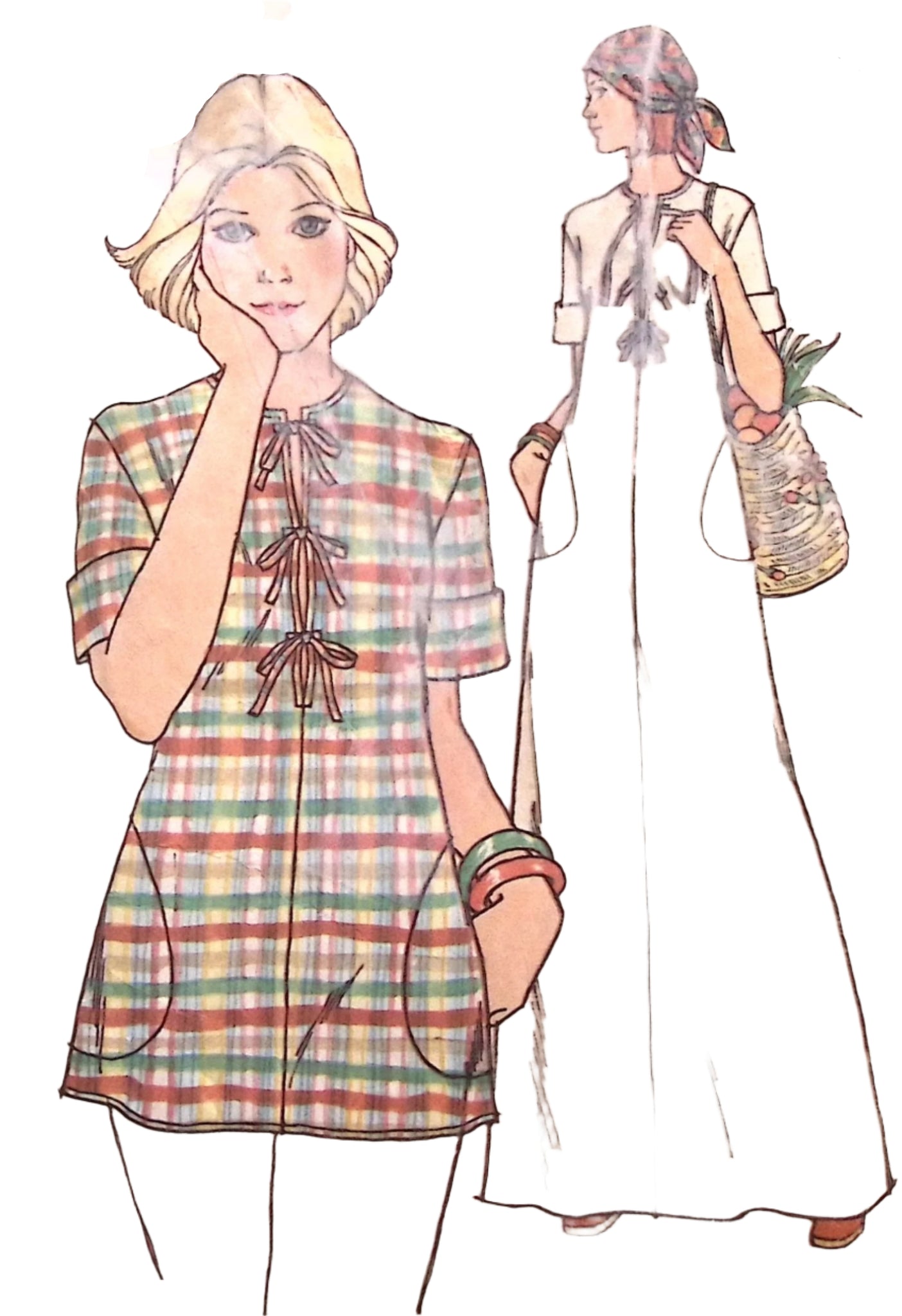 Misses' Caftan & Top: Get groovy with this vintage sewing pattern from the 70's! The Misses' Caftan & Top are both loose-fitting and stylish, featuring a jewel neckline with self ties, wide sleeves with turned back cuffs, and pockets. Topstitch trim and a front slit add the perfect touch. Pants and a scarf can be purchased separately. ©1975.