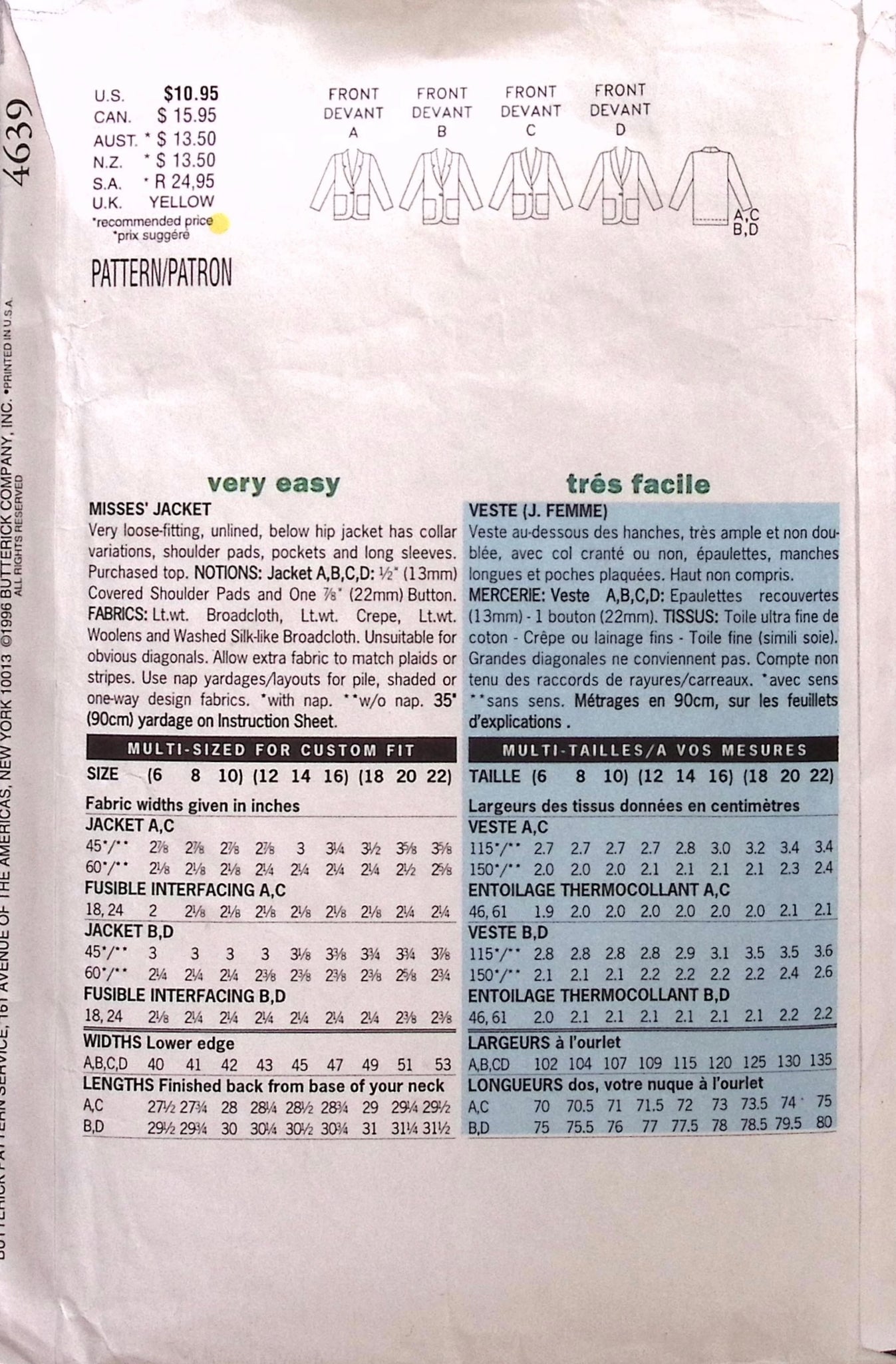 Misses' Jacket: Whip up a stylish jacket with ease using Butterick's Misses Jacket Fast & Easy vintage sewing pattern. Perfect for the fashion-forward seamstress looking to add a touch of retro flair to their wardrobe. Get ready to stitch up some serious style! ©1996.