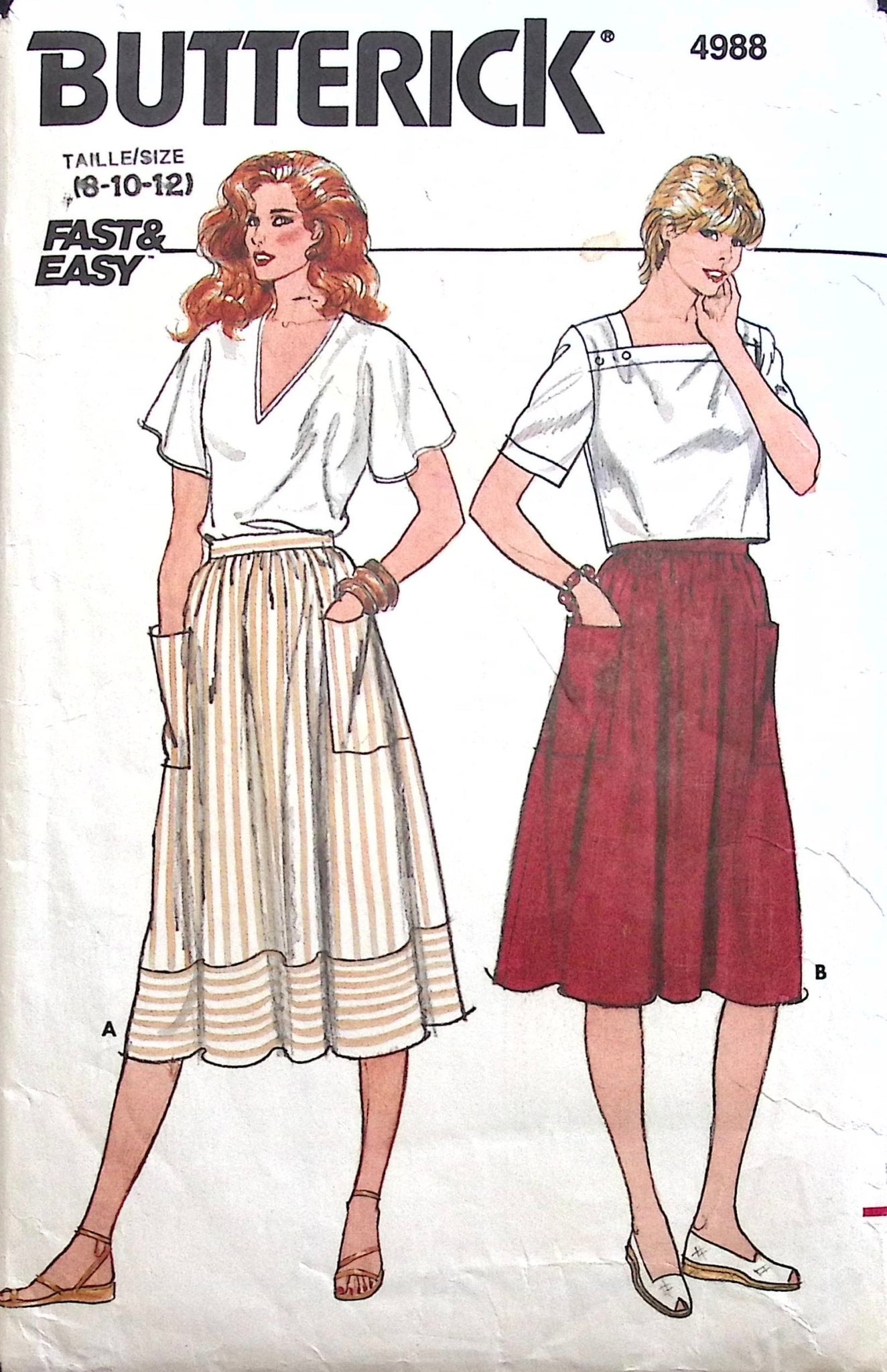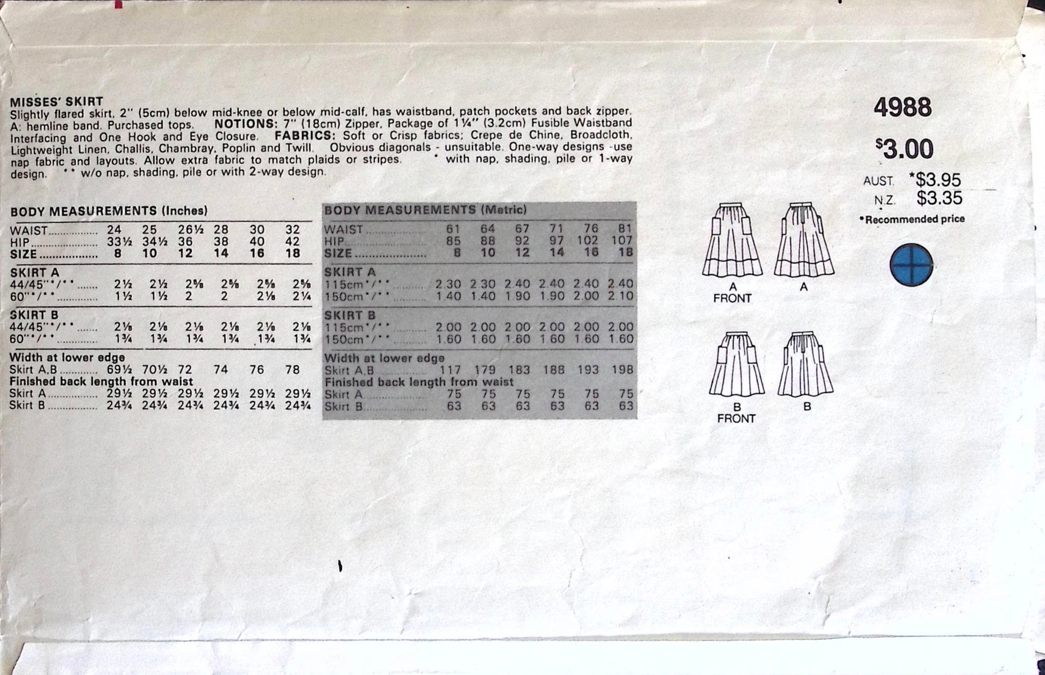 Misses’ Skirts: This pattern boasts a slightly flared silhouette, adding a touch of elegance to any ensemble. Designed with practicality in mind, it features a waistband for comfort, convenient patch pockets, and a back zipper for easy wear. ©1980’s.