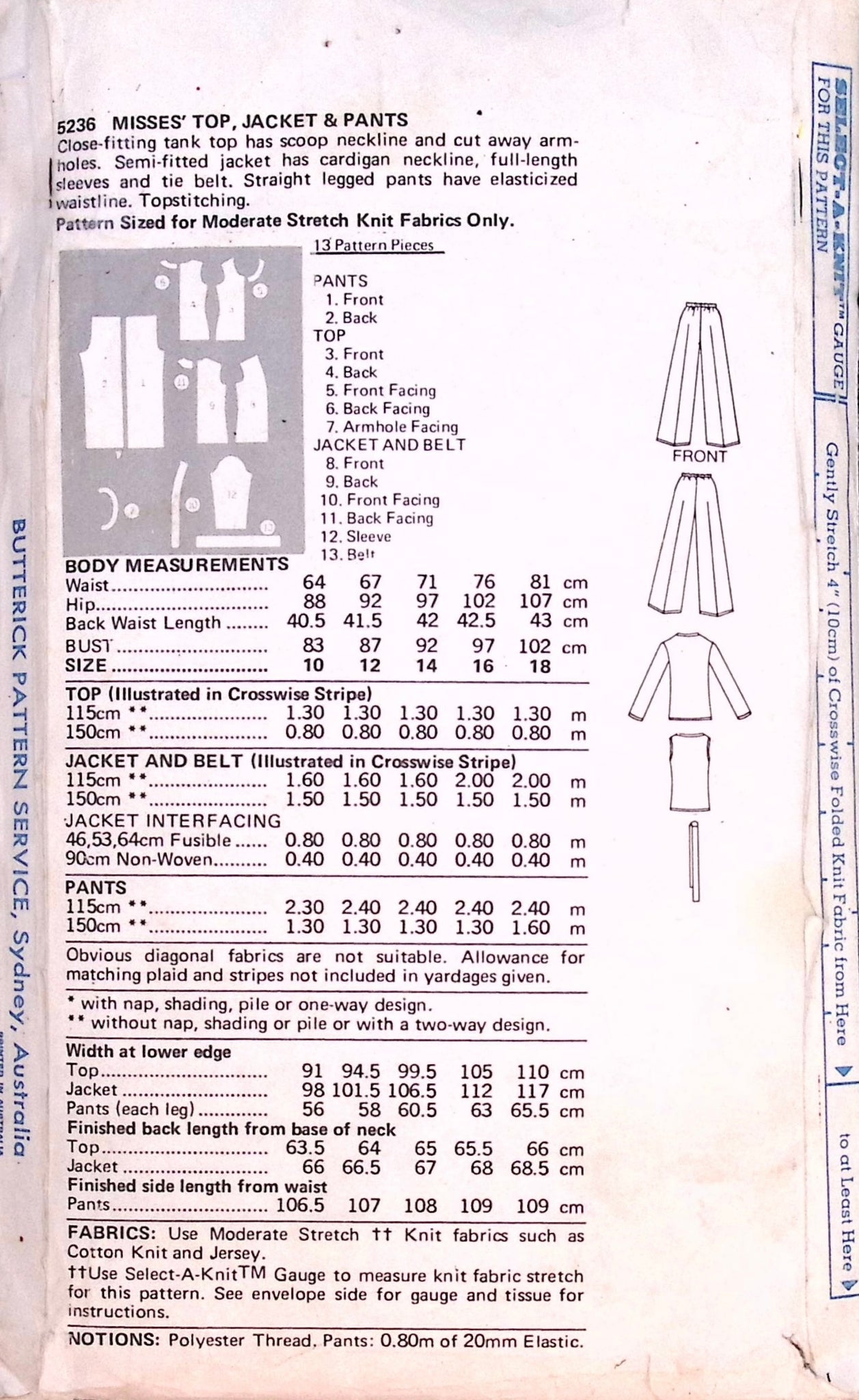 Misses' Top, Jacket & Pants: Achieve a sleek and close-fitting look with this tank top featuring a scooped neckline and cutaway armholes for a stylish and comfortable feel. The semi-fitted jacket offers a cardigan neckline, full-length sleeves, and a tie belt, providing a versatile and chic addition to your wardrobe. Complementing the ensemble, the straight-legged pants boast an elasticised waistline for ease and comfort. All pieces are enhanced with topstitching, adding a refined finishing touch to this fashionable and coordinated set. ©1970's.