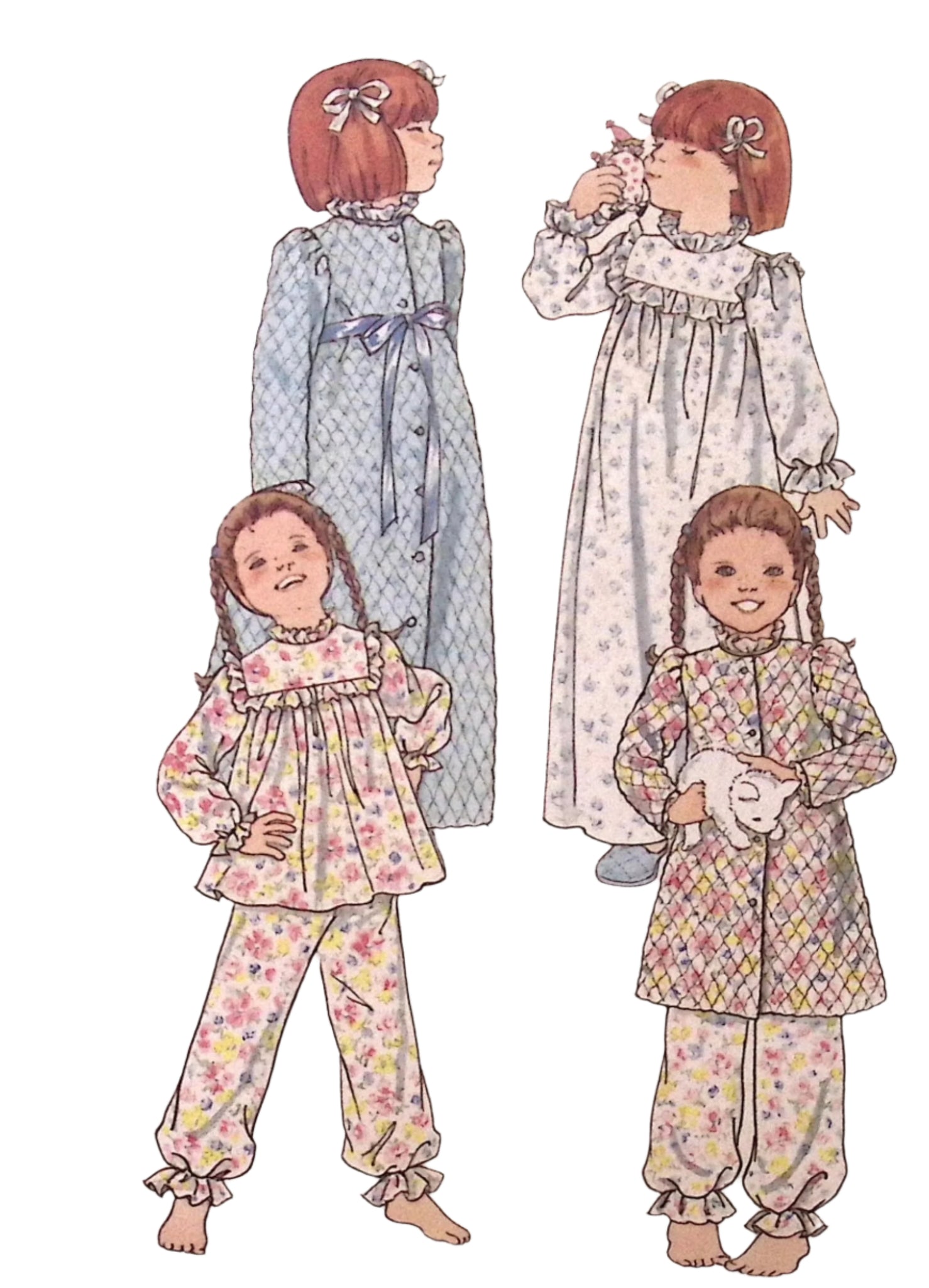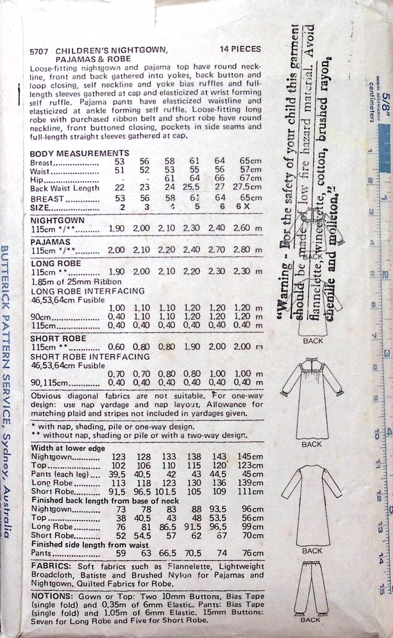 Child's Nightgown, Pyjamas & Robe: Get ready for a cozy night in with the Vintage Sewing Pattern: Butterick 5707! This pattern includes loose-fitting nightgowns, pyjamas and robes for a comfortable night's sleep. Featuring gathered details, elasticised waistbands, and feminine ruffles, you'll be sleeping in style. Plus, with pockets and a button closure, you'll have everything you need for a relaxing evening. ©1970's.