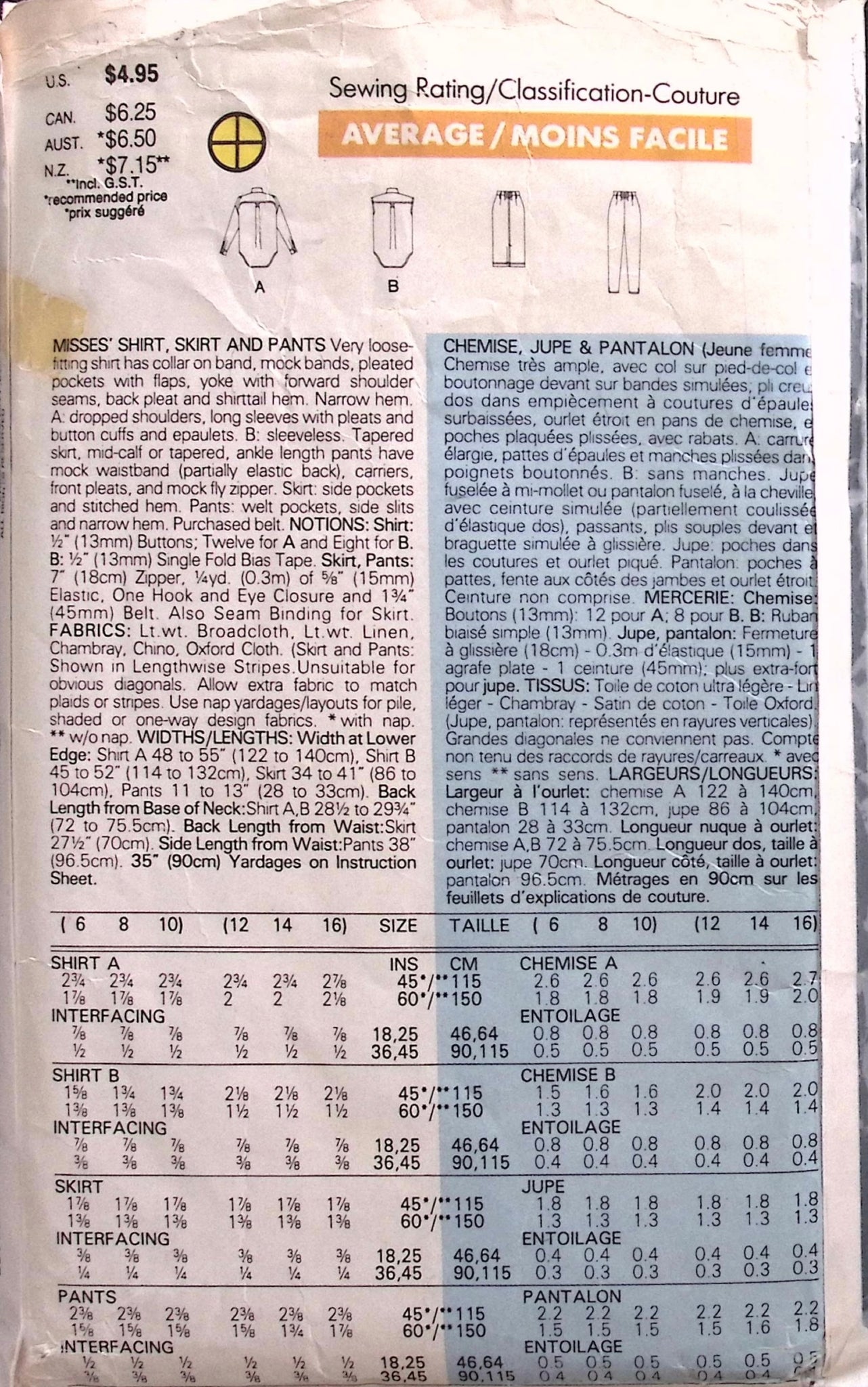 Misses' Shirt & Skirt: Rock some vintage vibes with this fun and flirty sewing pattern! The shirt features a trendy collar on a band, pleated pockets, and a back pleat for added charm. Choose from long sleeves with button cuffs or a sleeveless option. The skirt has a mock waistband and front pleats for a flattering fit.©1988.
