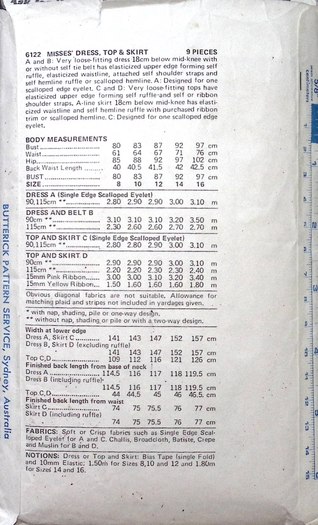 Misses' Dress, Top & Skirt: Get retro with this vintage sewing pattern from Butterick! Create a playful dress, top, or skirt with elasticised edges, self ruffles, and scalloped hemlines. Perfect for a fun and unique addition to your wardrobe. Designed for one scalloped edge eyelet. ©1980's.