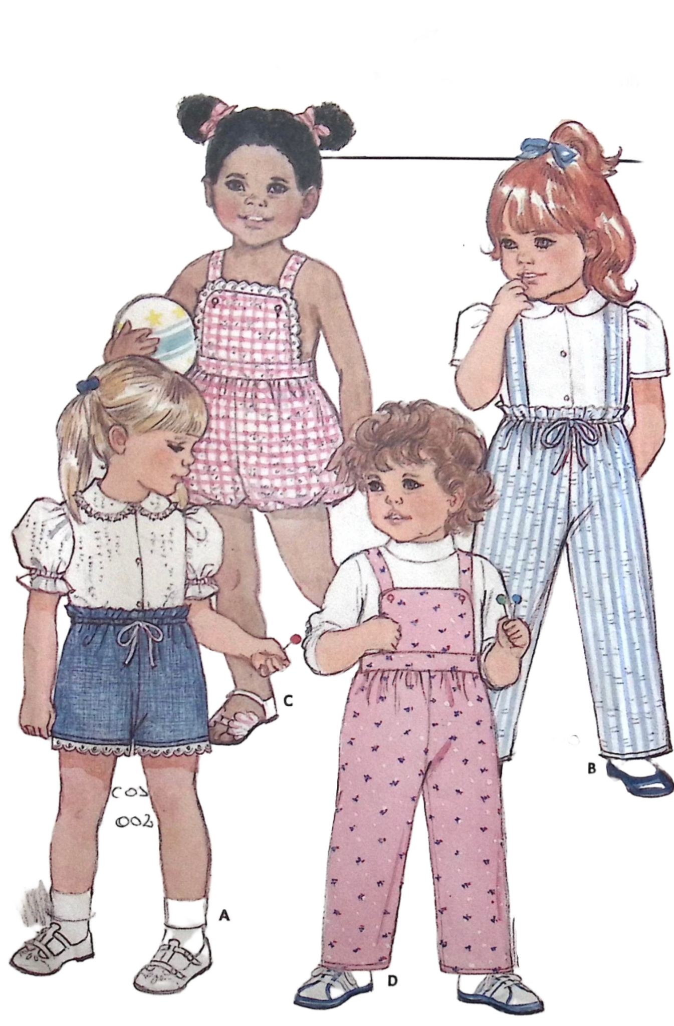 Toddlers’ Shorts, Pants & Overalls: The shorts or slightly tapered pants feature an elastic waist and a purchased tie for easy wear and adjustment. Additional options include button shoulder straps for added charm and style. The overalls come with button shoulder straps, a bib, and a waistband (with elastic at the back) for a comfortable fit. Optional trim or elastic at the lower edge adds a touch of customisation, while the slightly tapered design ensures a tailored look. ©1980’s.