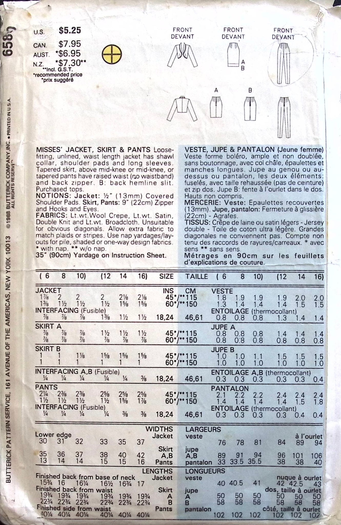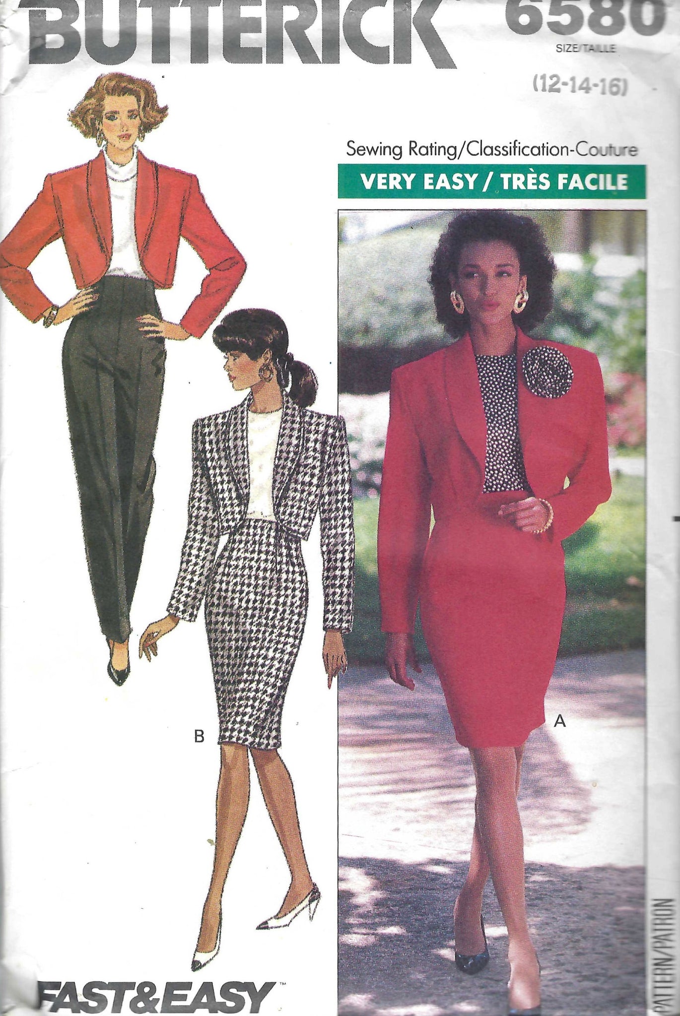 Misses’ Jacket, Skirt & Pants: A loose-fitting, unlined waist-length jacket with a shawl collar, shoulder pads, and long sleeves for a classic look. Pair it with either a tapered skirt or tapered pants, both with a raised waist and back zipper for ease of wear. The skirt also includes a back hemline slit for added mobility and style. ©1988.