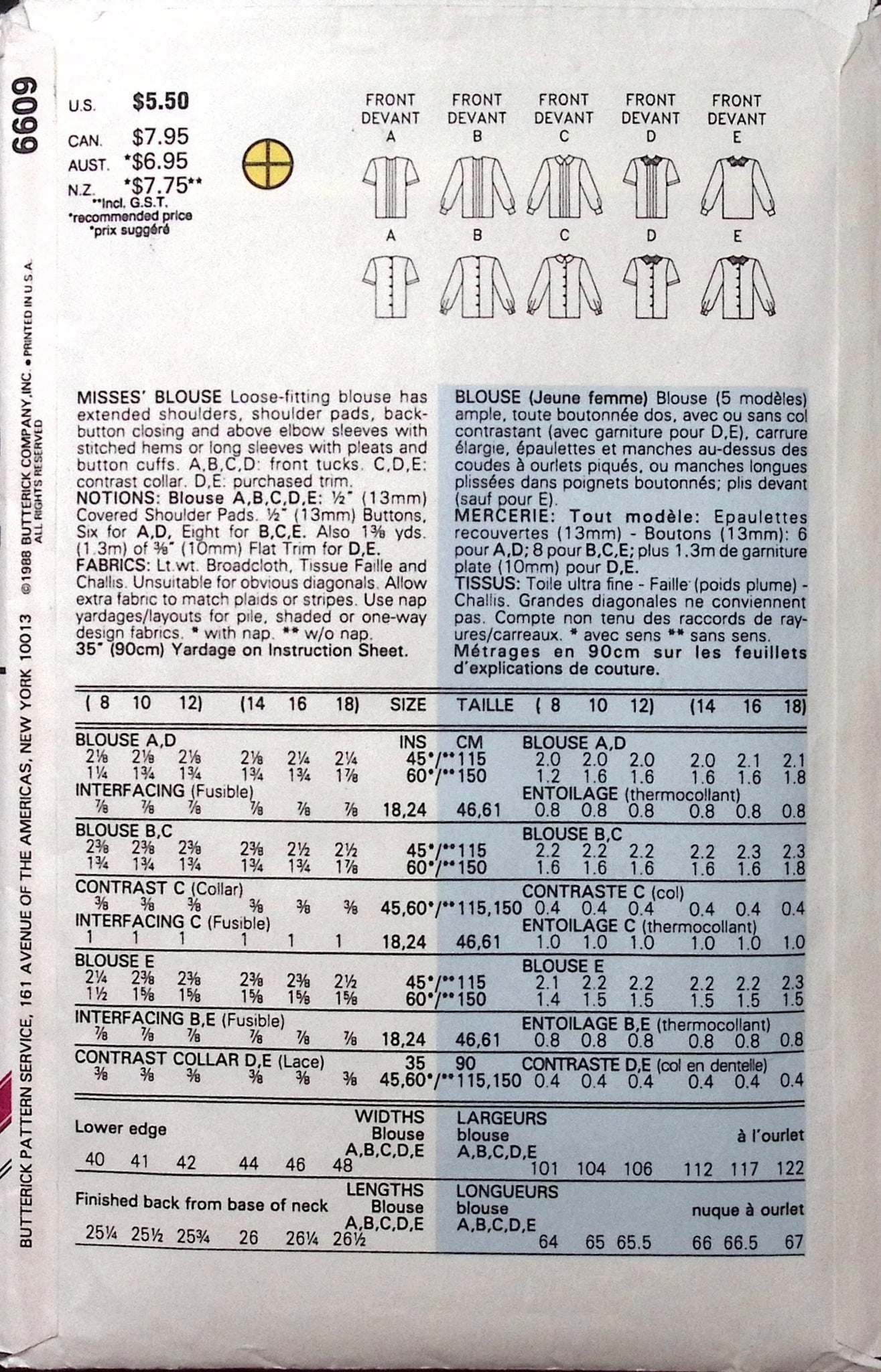 Misses' Blouse: Get ready to sew up some vintage style with the Butterick 6609 sewing pattern! This pattern features a loose fitting blouse with extended shoulders, back button closure, and versatile sleeve options. Add in front tucks, a contrast collar, and decorative trim for a unique touch. Step back in time with this fashionable and playful design. ©1988.