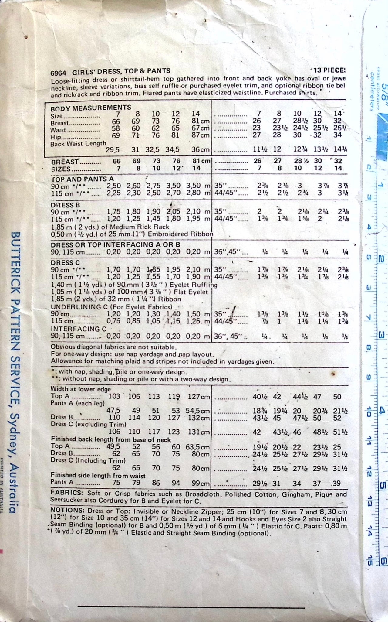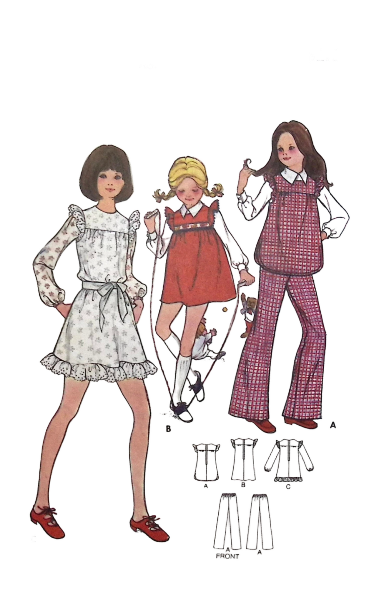 Girls’ Dress, Top & Pants: This pattern offers versatile options for a retro-inspired wardrobe. The loose-fitting dress or shirttail hem top features gathering into front and back yokes, with neckline variations including oval or jewel necklines. Sleeve options range from bias self-ruffles to various trims, allowing for customisation. The flared pants boast an elastic waistline for comfort and ease of wear. ©1970’s.