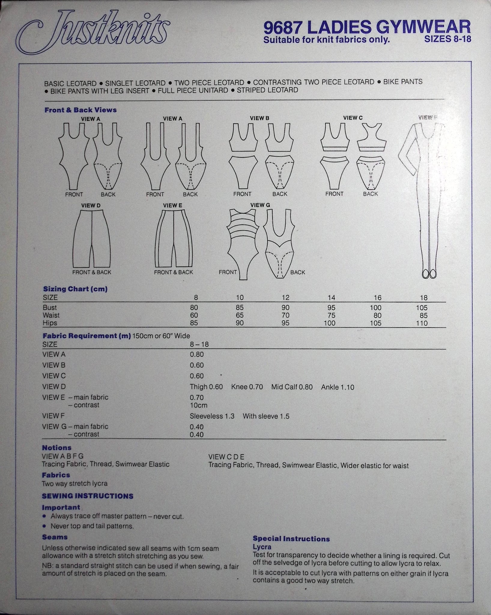 Ladies Gymwear: this versatile collection offers essential gymwear options. Choose from a basic leotard, a stylish single leotard, a chic two-piece leotard, a dynamic contrasting two-piece leotard, bike pants with or without a leg insert, a comfortable full-piece unitard, and a sporty striped leotard. Elevate your fitness wardrobe with these fashionable and functional designs. ©1980's.