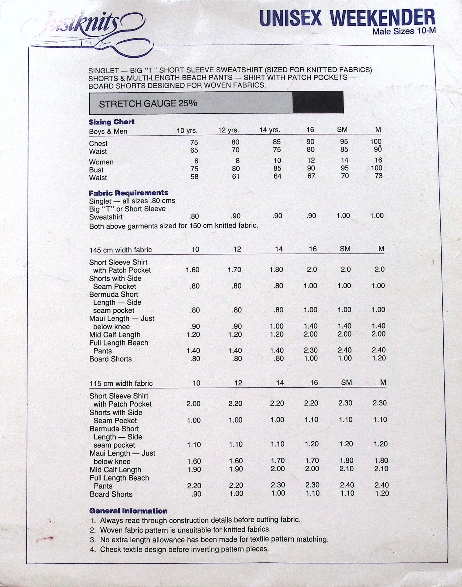 Unisex Weekender: The pattern includes a classic singlet top, a relaxed "T" short-sleeved sweatshirt ideal for knit fabrics, and stylish board shorts designed for woven fabrics. The ensemble is completed with a shirt featuring patch pockets, comfortable shorts, and multi-length beach pants, providing options for various preferences and occasions. With its inclusive sizing and thoughtful design elements, this pattern is perfect for creating a coordinated set of casual, comfortable, and stylish pieces suitable for the entire family's summer wardrobe. ©1980's.