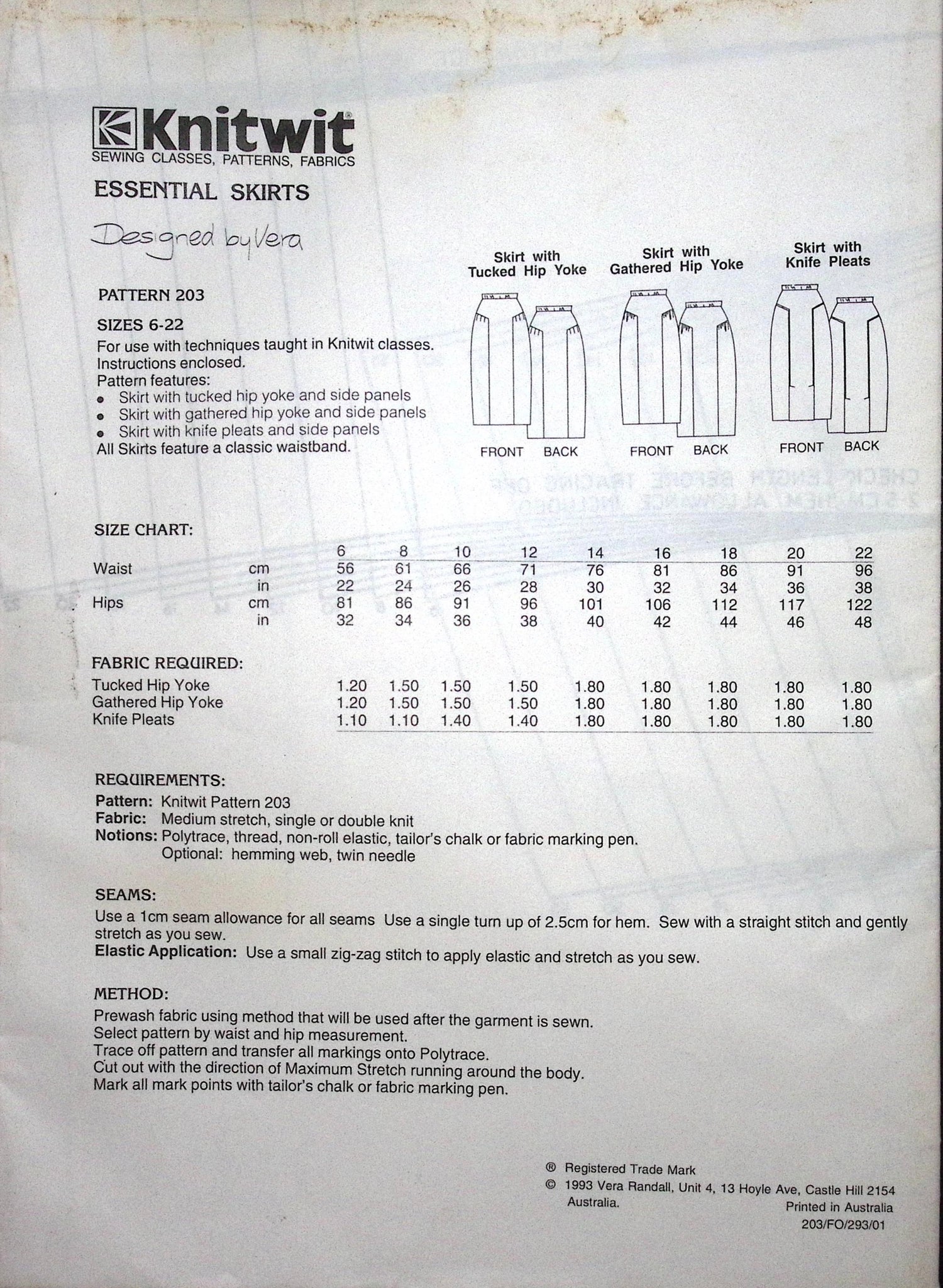 Misses’ Skirts: Choose between a chic tucked hip yoke and side panels for a modern touch, a playful gathered hip yoke and side panels for added flair, or opt for the timeless elegance of knife pleats combined with side panels. All designs showcase a classic elastic waistband, ensuring a comfortable and customizable fit. With this pattern, you can effortlessly craft skirts that seamlessly transition from casual outings to more refined settings, showcasing your unique fashion sense. ©1993.