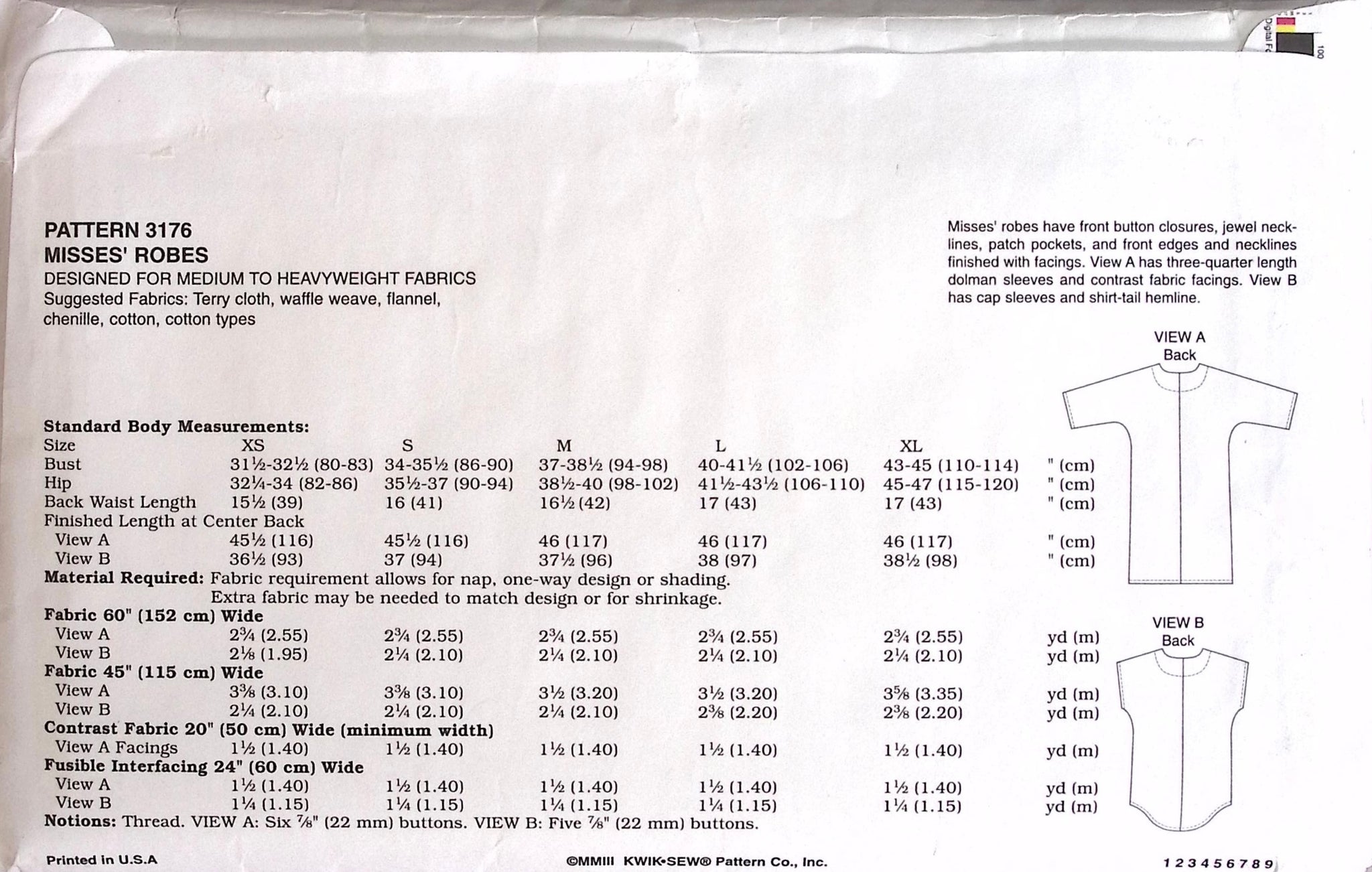 Misses' Robes: Cute and cozy vintage sewing pattern for misses robes with front button closure and jewel neckline. Comes with options for patch pockets and cap or three-quarter sleeves. Perfect for a lazy Sunday morning or a relaxing evening at home. Sew up your own unique and comfortable robe with this Kwik Sew 3176 pattern. ©1990's.