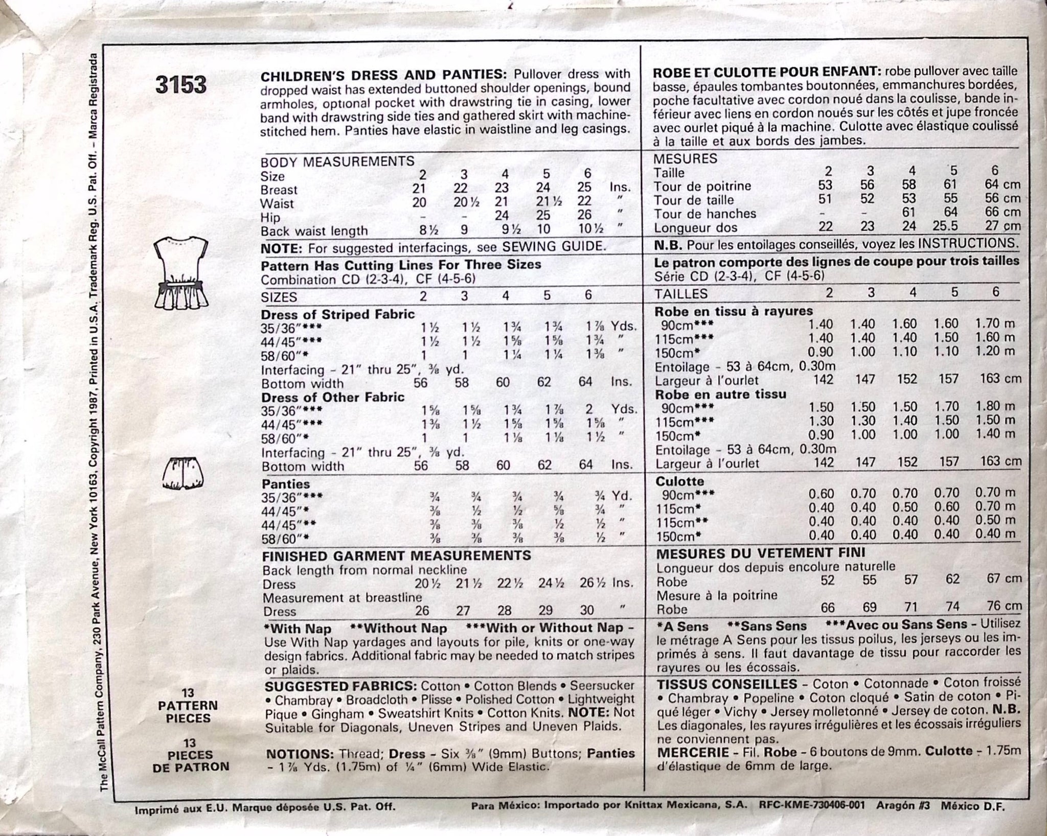 Child’s Dress & Panties: The pullover dress features a dropped waist and a buttoned shoulder opening, allowing for easy dressing and a charming look. Optional pockets with drawstring ties in casings add practicality and sweet detailing. Paired with matching panties, this ensemble is perfect for everyday wear. ©1987.