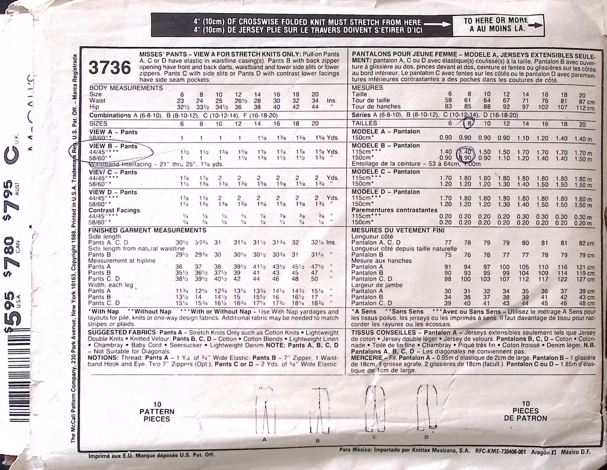 Misses’ Pants: The pull-on pants in View A feature elastic in the waistline casing, providing ease and convenience. For an additional touch of sophistication, choose View B with a back zipper opening. This option includes front and back darts, a waistband, and lower side slits or lower zippers, offering a tailored look and added versatility. Whether you prefer the effortless pull-on style or the polished appeal of the back zipper, this pattern ensures a comfortable and fashionable addition to your wardrobe. ©1988.
