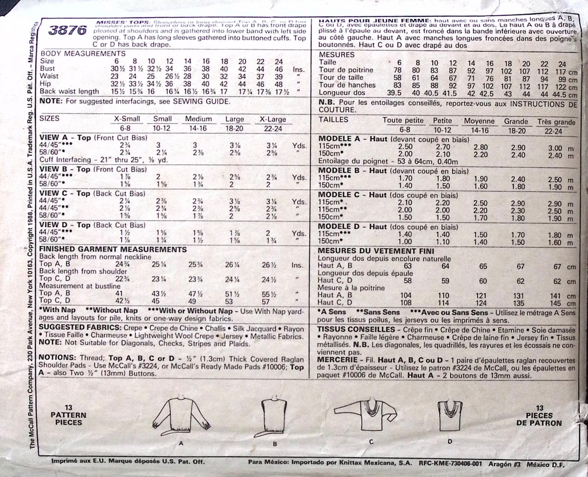 Misses’ Tops: Elevate your style game with this versatile sewing pattern for 80's tops. Choose from various sleeve and drape options to add a touch of elegance and sophistication to your look. With added shoulder pads for structure and shape, these tops are perfect for any occasion. Step into the 80's with this must-have pattern. ©1988.