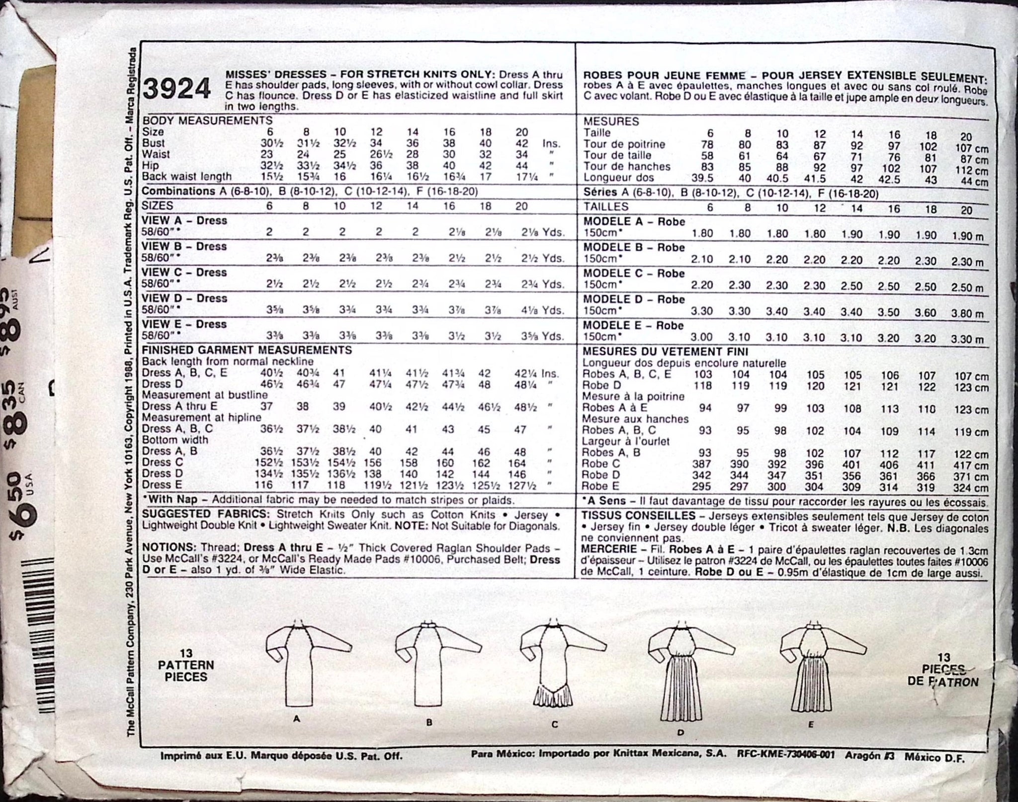 Misses' Dresses: The dress features options for long sleeves, complete with or without a stylish cowl collar, allowing you to customize your look. Choose between a flounced, straight, or full skirt, with the full skirt offering added comfort through an elasticised waist and convenient side seam pockets. Elevate your style by incorporating shoulder pads for a touch of sophistication. With easy-to-follow instructions, this pattern is suitable for various skill levels, empowering you to create a dress that perfectly complements your individual taste and fashion preferences. Enjoy the creative process as you sew a garment that seamlessly blends comfort and elegance. ©1988.