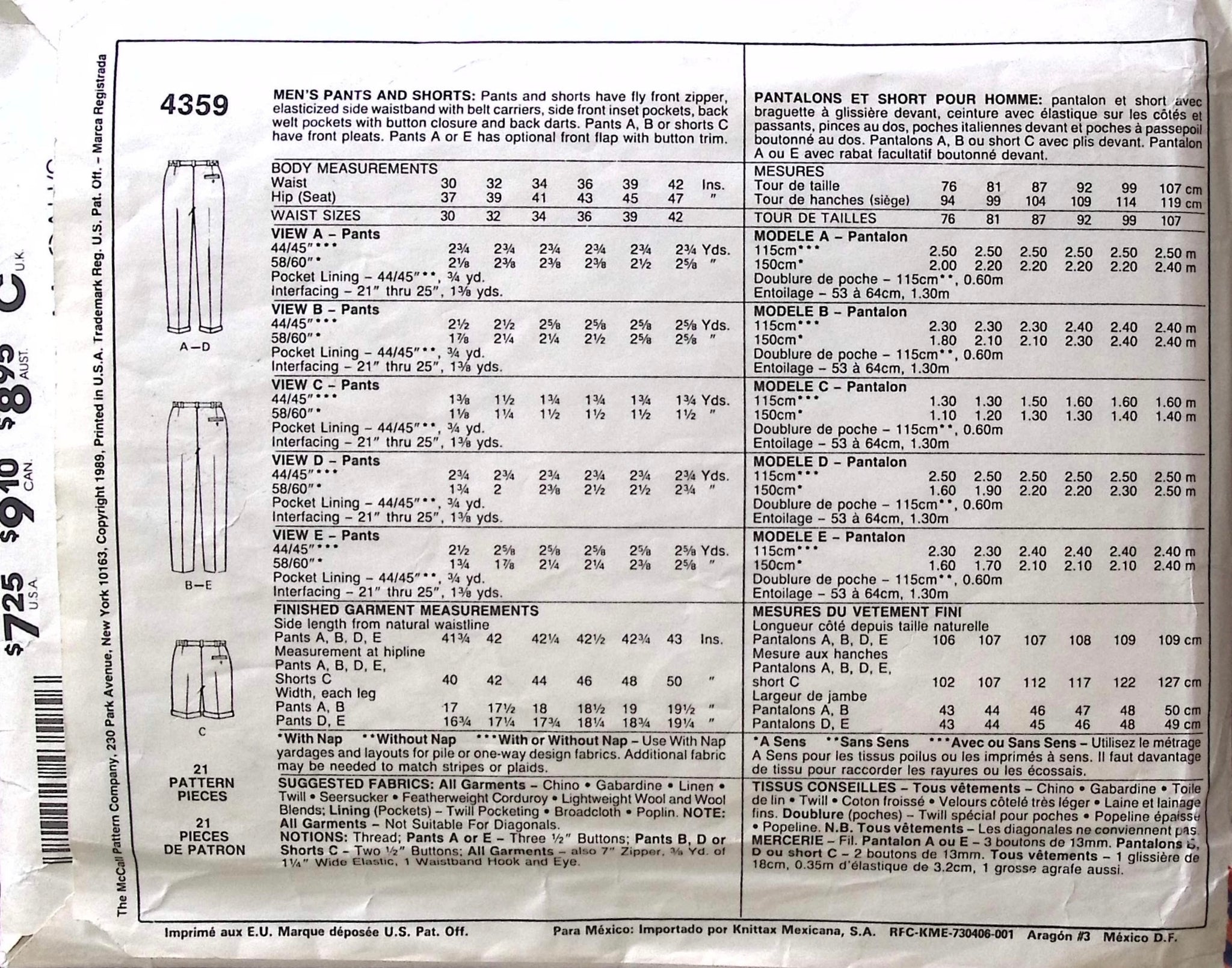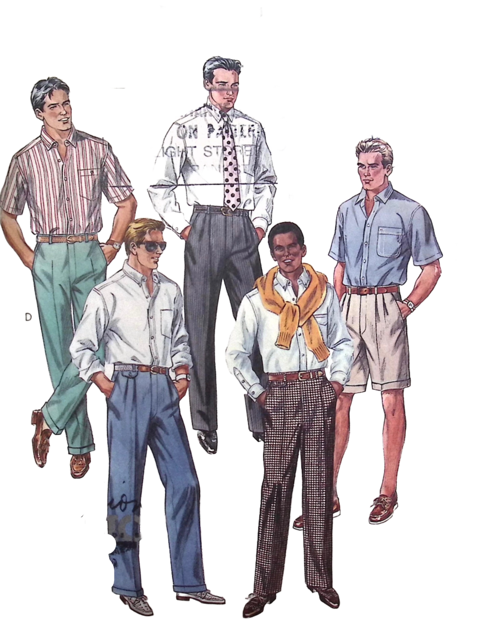Men’s Pants & Shorts: Both the pants and shorts feature a fly front zipper, an elasticised side waistband with belt carriers, and side front inset pockets for convenience. Additionally, they include back welt pockets with button closure and back darts for a tailored fit. The design offers versatility with options for front pleats or an optional front flap with button trim, allowing for customisation to suit individual preferences. ©1989.