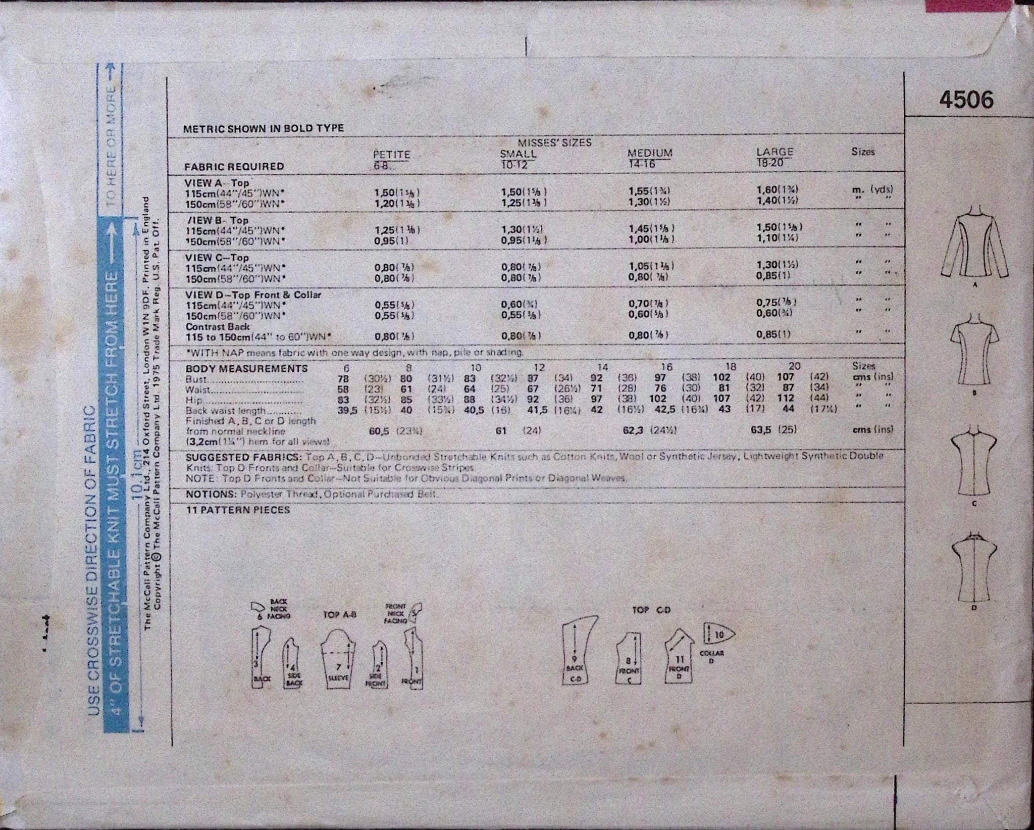 Misses’ Tops: Transport yourself to the stylish era of the 1970s. This collection captures the essence of the decade, offering fitted tops with a delightful array of neckline and sleeve variations. Embrace the fashion-forward spirit of the '70s with unique and personalised styles, featuring the distinctive details that characterised the era. Whether you choose a daring neckline or playful sleeve variations, this pattern allows you to infuse your wardrobe with the retro charm and individuality of the 1970s, creating tops that effortlessly blend nostalgia with contemporary flair. ©1975.