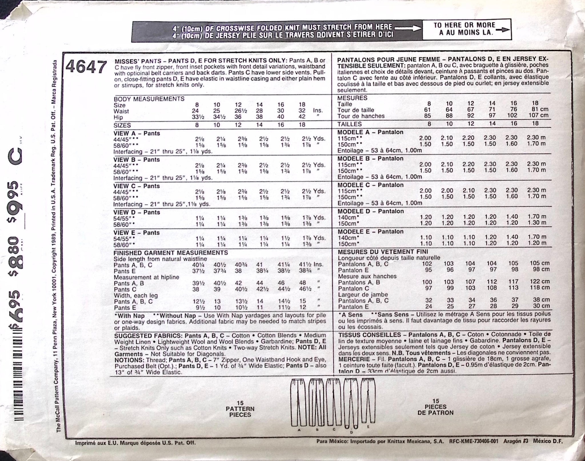 Misses’ Pants: The design offers versatility with various front detail variations, allowing for customisation according to personal taste. Additionally, the pattern includes an option for lower side vents, adding a unique touch to the garment. ©1989.