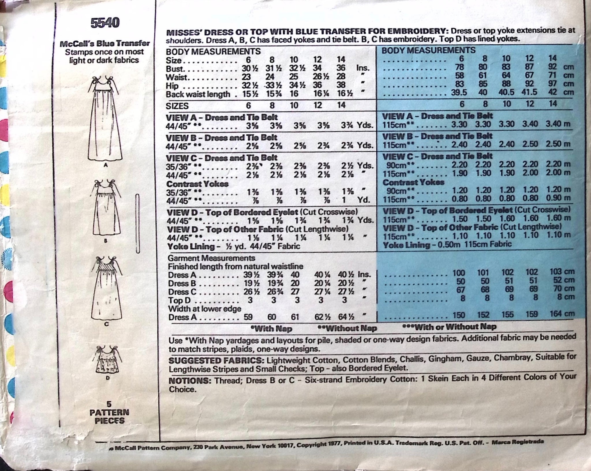 Misses’ Dress & Top: Both the dress and top feature yoke extensions that tie at the shoulders, adding a whimsical touch to the design. The dress comes with faced yokes and a tie belt, allowing for various styling options. Additionally, the pattern includes embroidery transfers to enhance the garments with intricate embellishments. For added elegance, the top features lined yokes, adding structure and refinement to the design. With these options, you can create stylish and personalised pieces with a vintage flair. ©1977.
