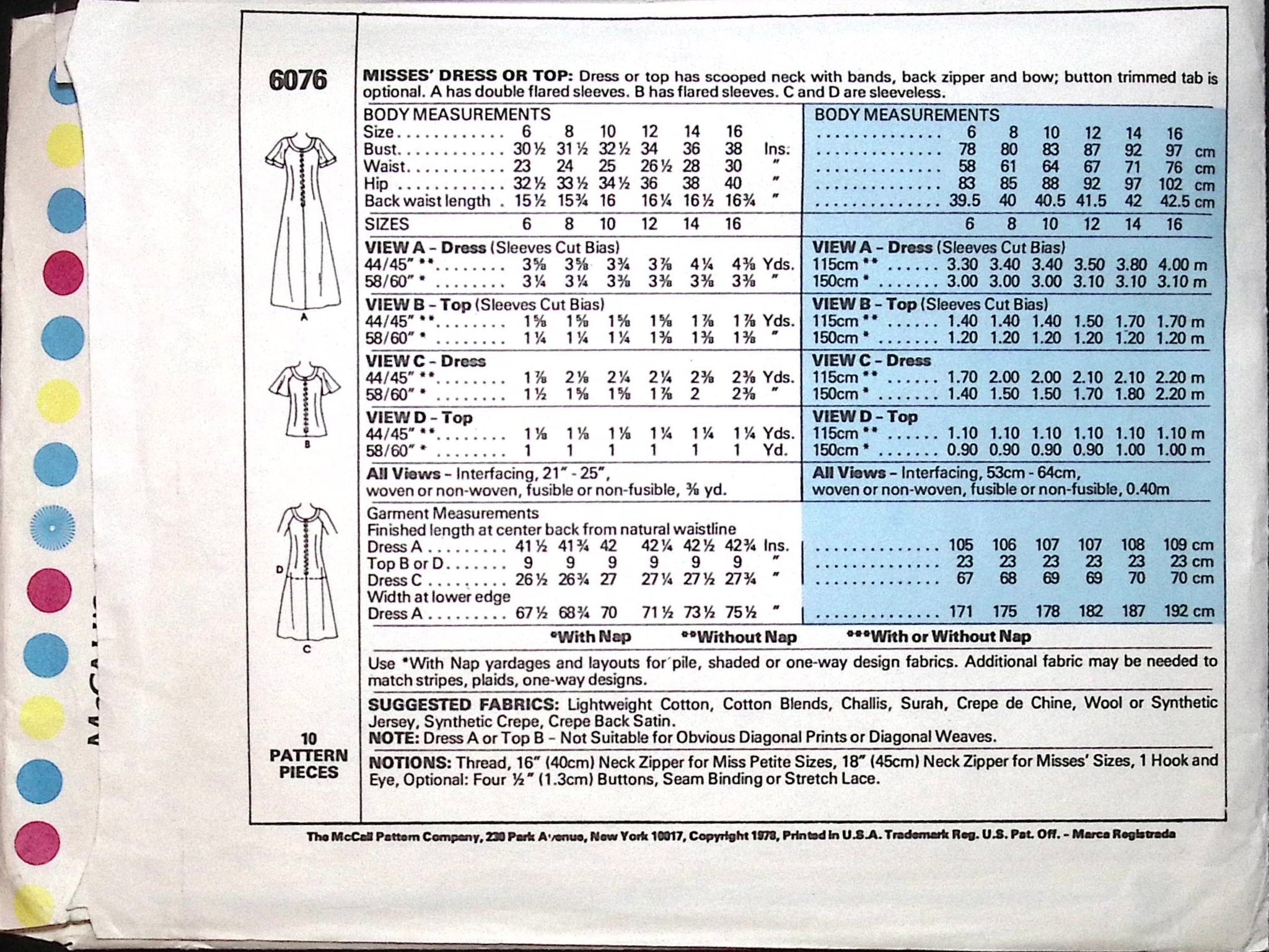 Misses' Dress or Top: The design features a scooped neck with bands, a back zipper, and a delightful bow detail, with an optional button-trimmed tab for added flair. Choose between two sleeve variations for a personalised touch: double-flared sleeves for a touch of whimsy in View A, or flared sleeves in View B. If you prefer a sleeveless look, Views C and D offer a chic and timeless option. With easy-to-follow instructions, this pattern is suitable for a range of sewing skill levels, allowing you to create a wardrobe staple that reflects your unique style. Discover the joy of sewing and embrace the versatility of this classic and feminine ensemble. ©1978.